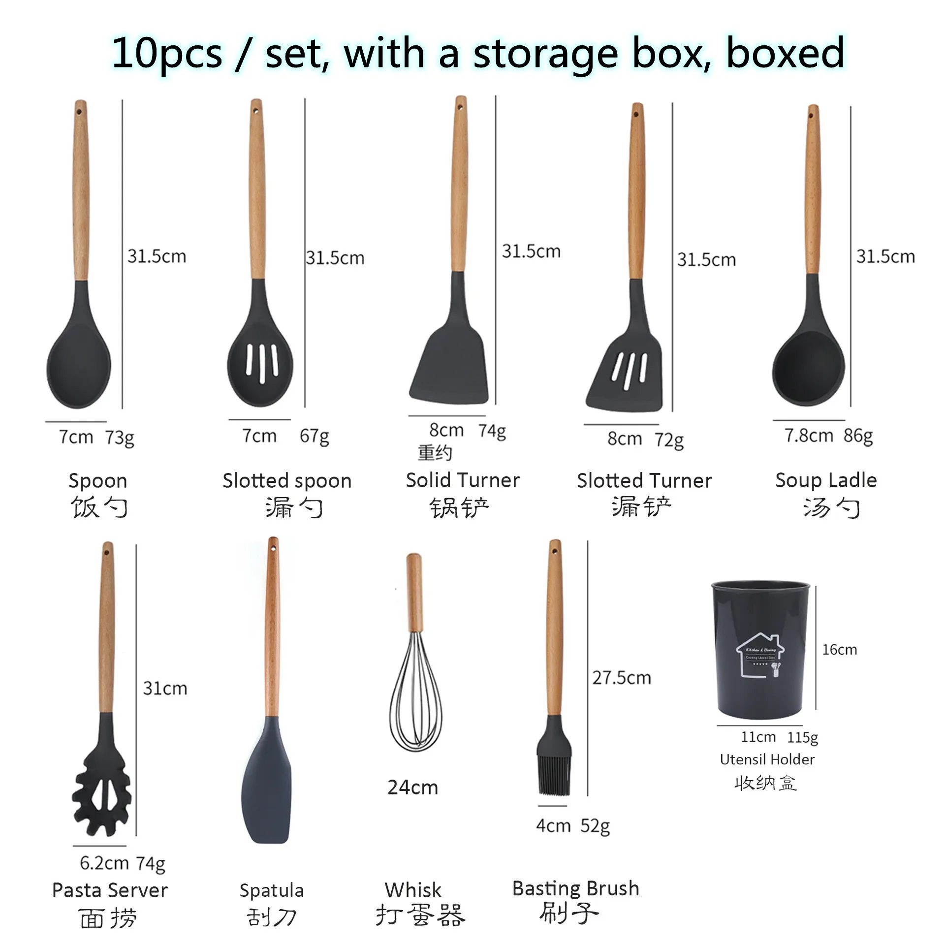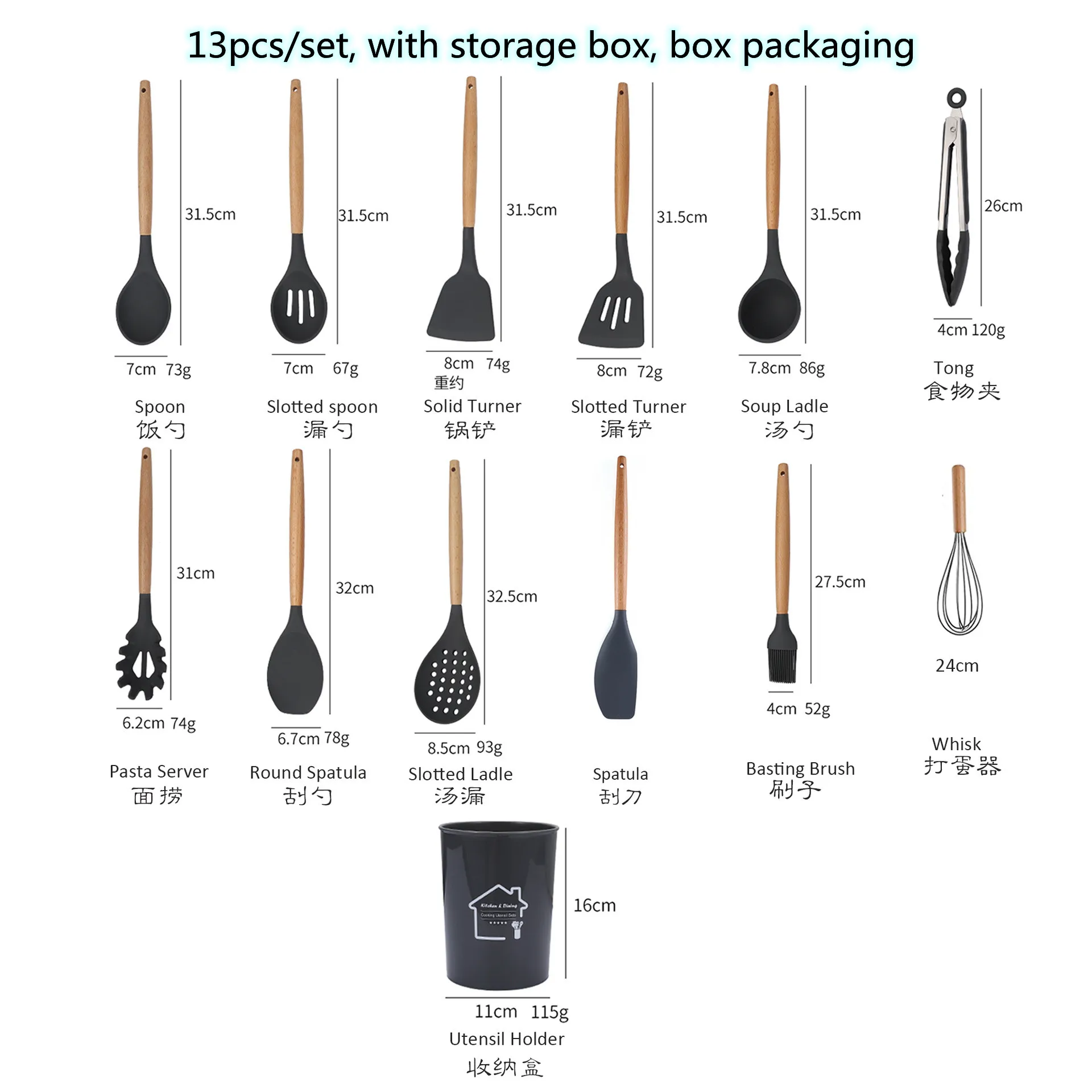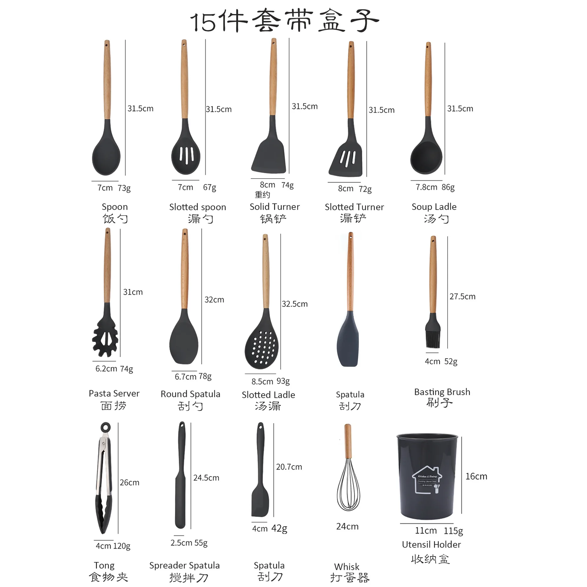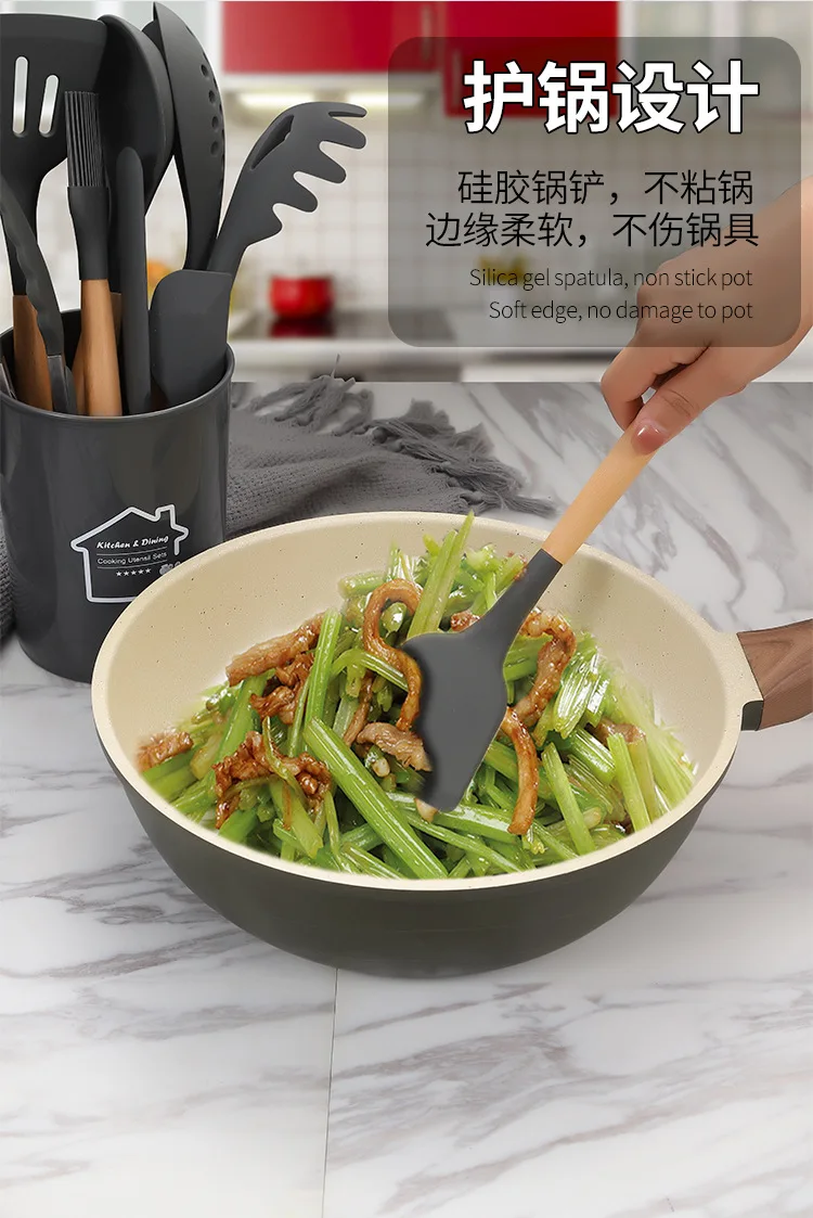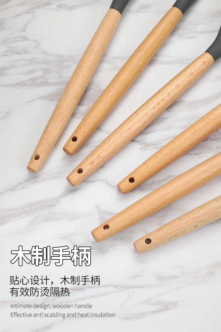 Wooden handle silicone kitchenware non-stick cookware cooking shovel spoon slotted shovel kitchen utensils with storage bucket