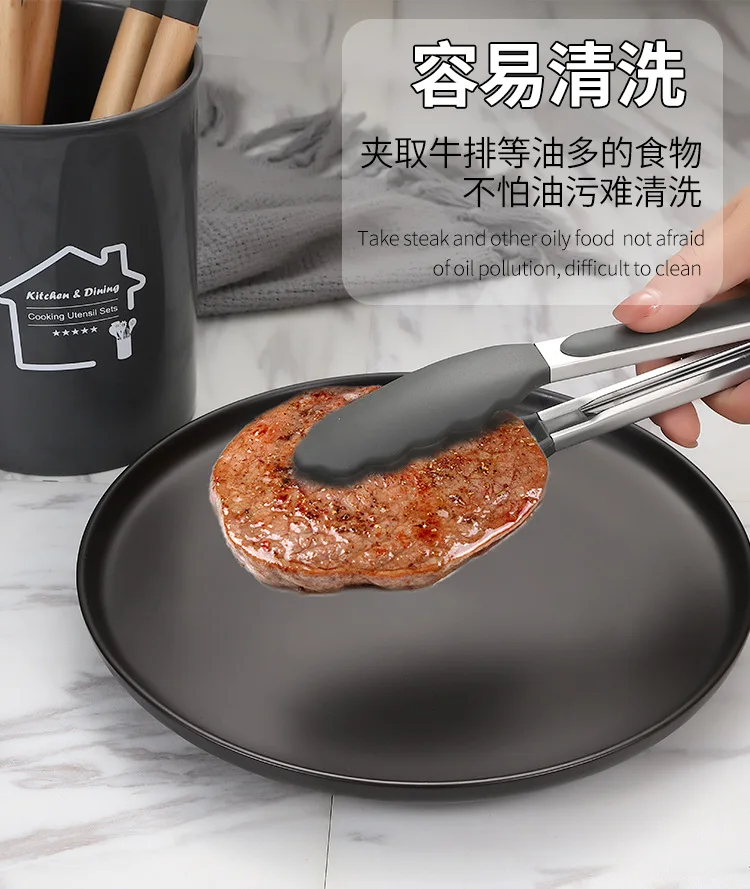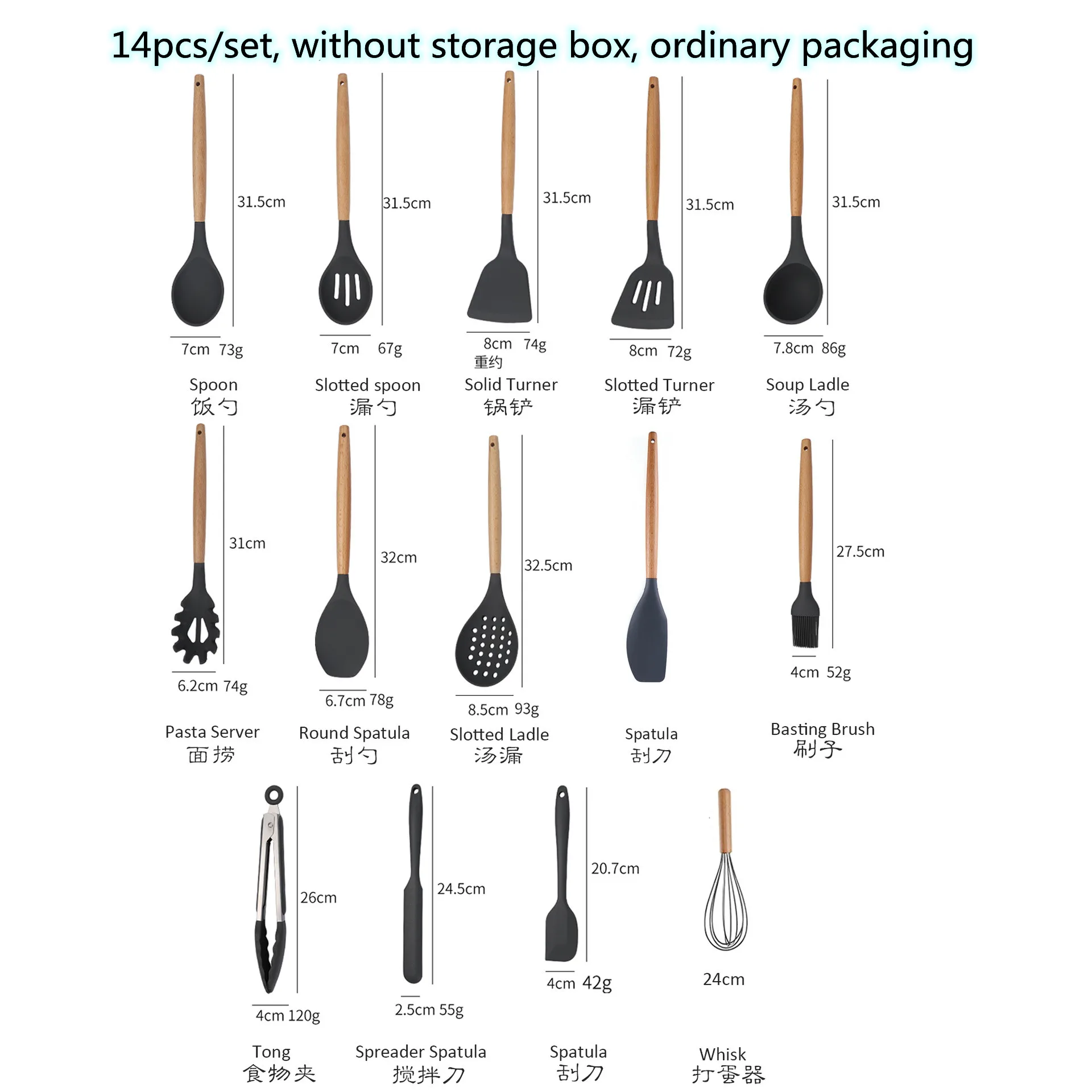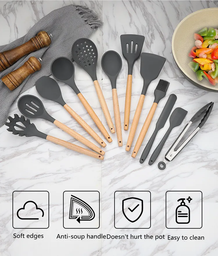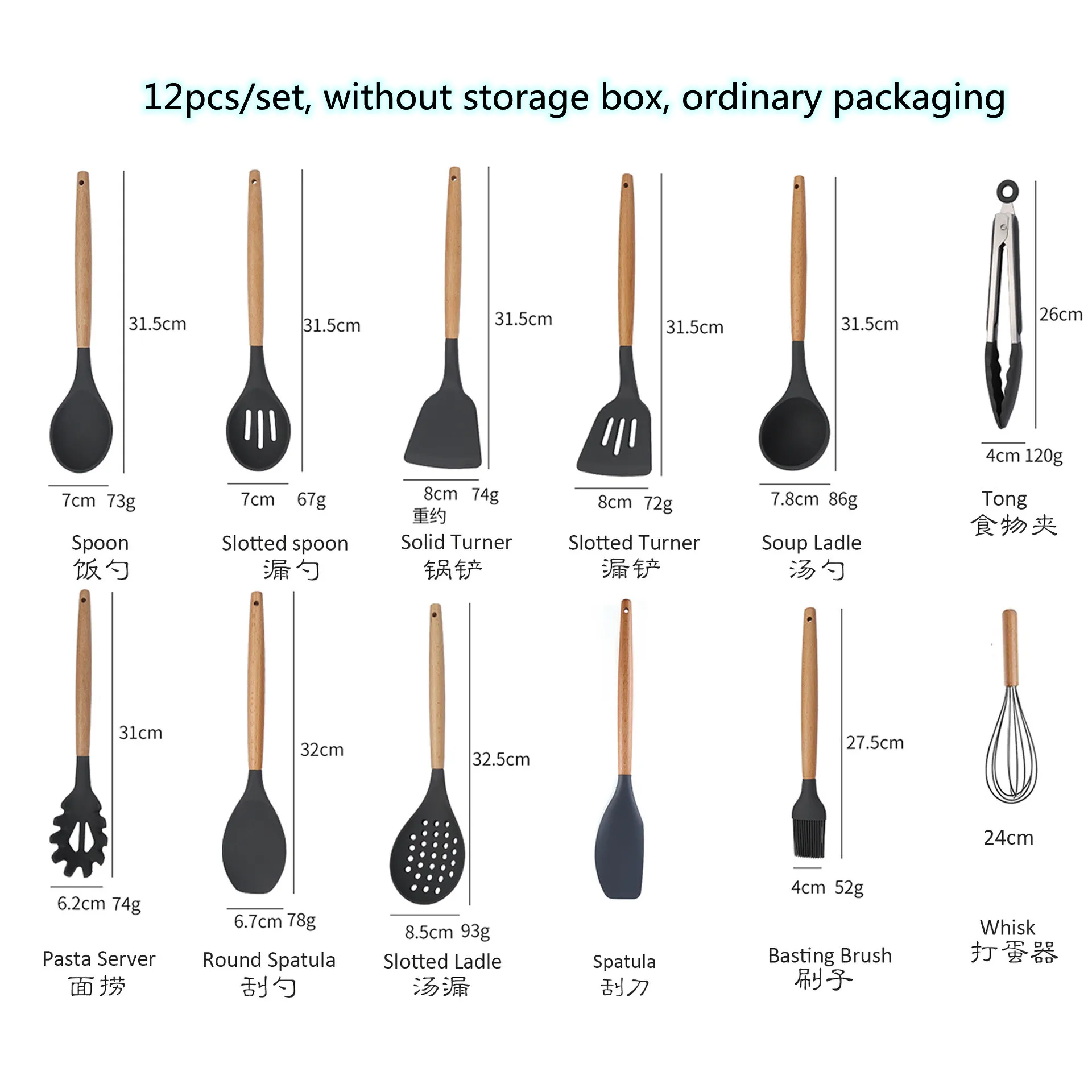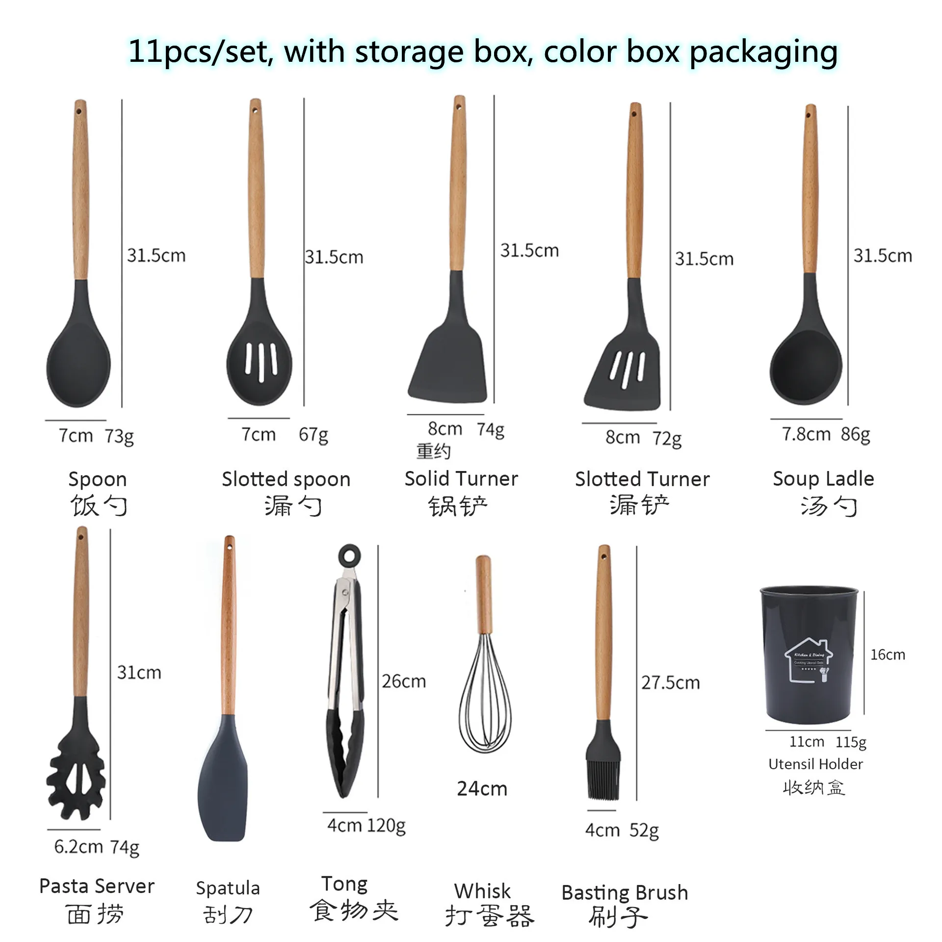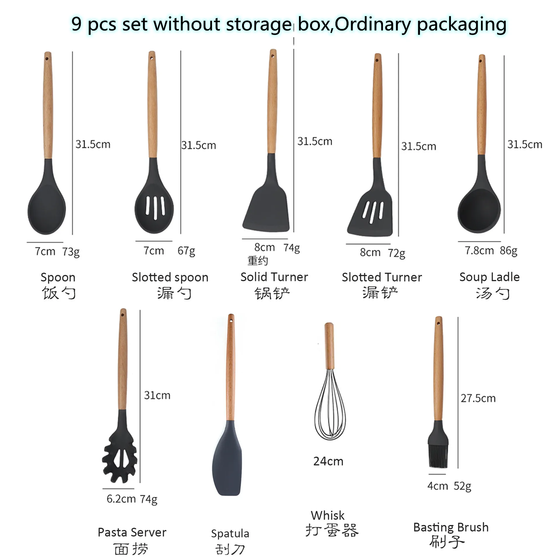 Wooden handle silicone kitchenware non-stick cookware cooking shovel spoon slotted shovel kitchen utensils with storage bucket