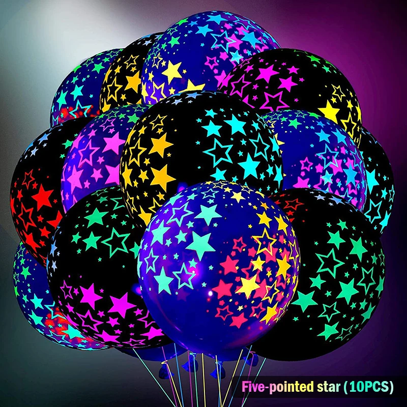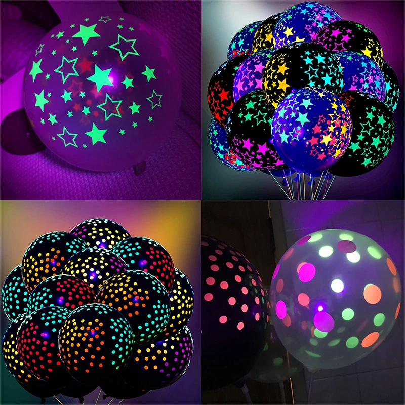 2. Дизайн с флуоресцентными звездами: Есть два вида латексных шаров, черные и прозрачные. Все они имеют флуоресцентный дизайн. На светящейся вечеринке воздушные шары будут светиться, что станет хорошим декором вечерние НКИ. (Примечание: флуоресцентные шары будут светиться только в УФ светильник, обычно используемых в флуоресцентных партиях.)