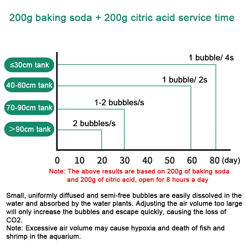 Примечание: маленькие, равномерно рассеиваемые и полусвободные пузырьки легко растворяются в воде и поглощаются водными растениями. Слишком большой объем воздуха только увеличит пузырьки и быстро исчезнет, что приведет к потере CO2. Примечание: чрезмерный объем воздуха может привести к гипоксии и смерти рыбы и креветок в аквариуме.