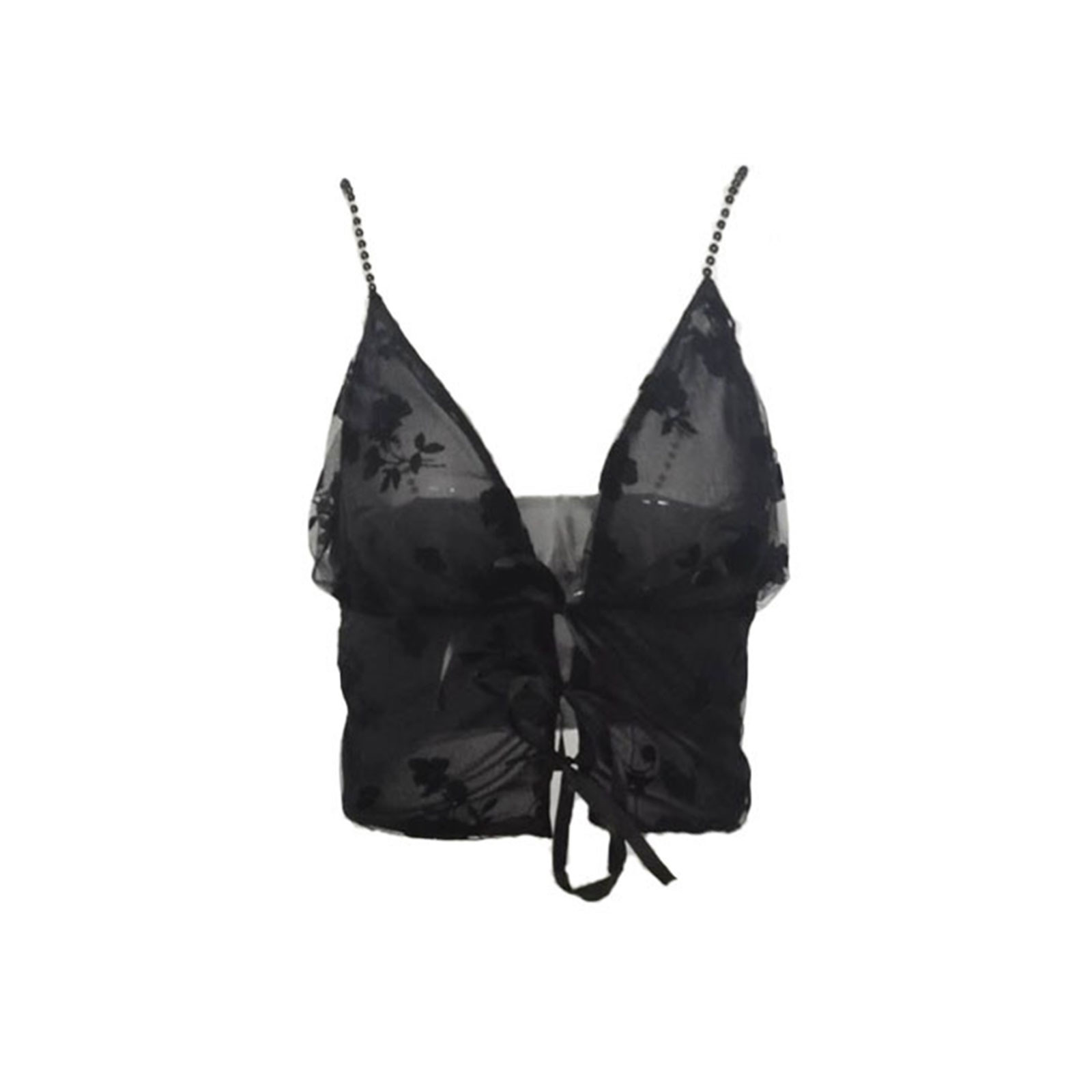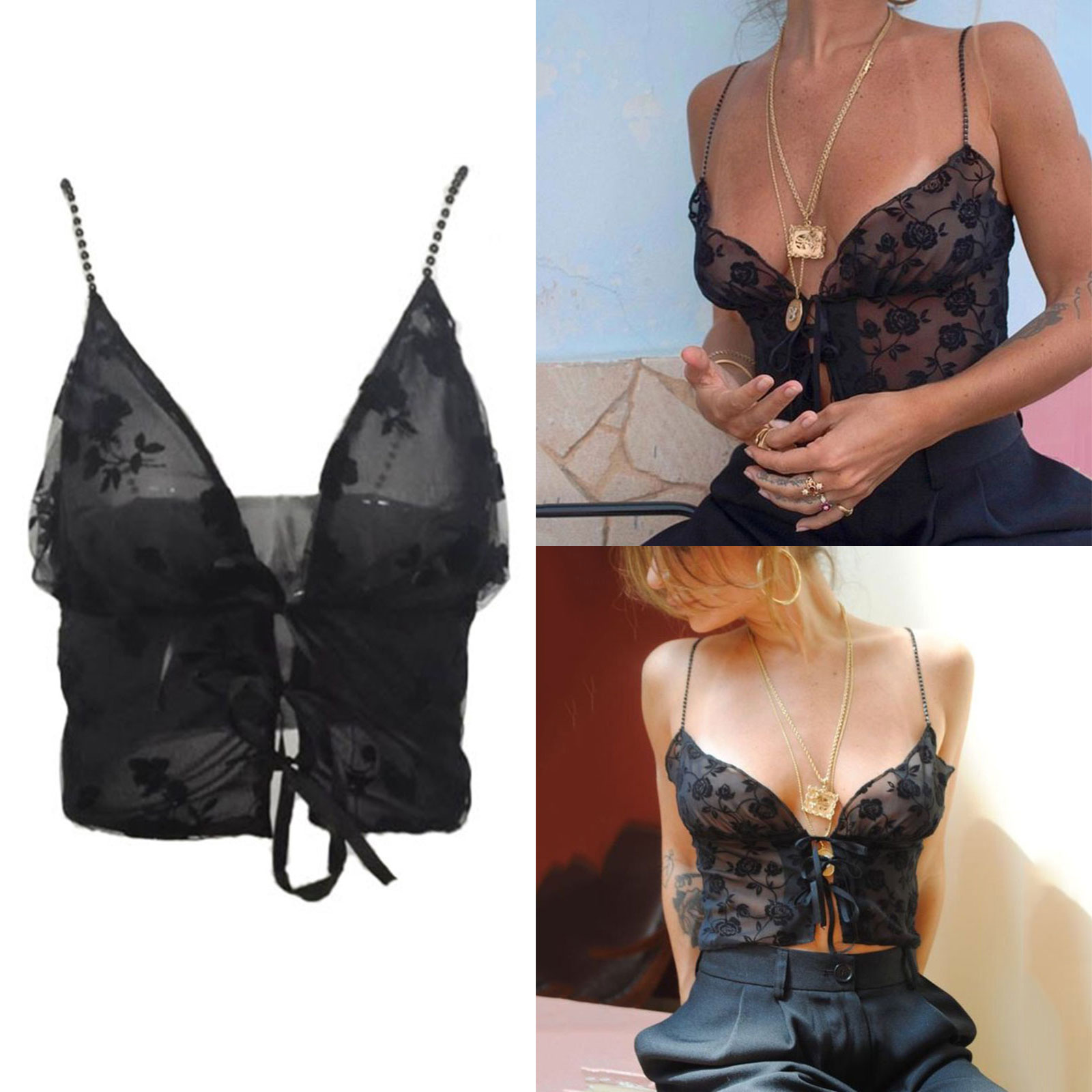 Женский сексуальный укороченный топ на бретельках, стразы на бретельках крест-накрест, кружевная прозрачная сетчатая Цветочная майка
