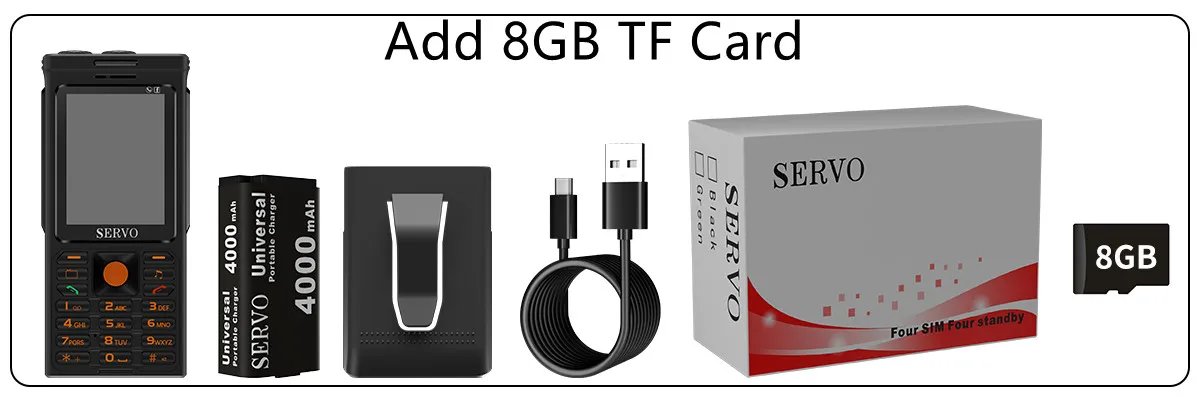 1 * телефон, 1 * чехол на ремешке, 1 * аккумулятор, 1 * USB кабель, 1 * коробка, 1*8 Гб карта памяти