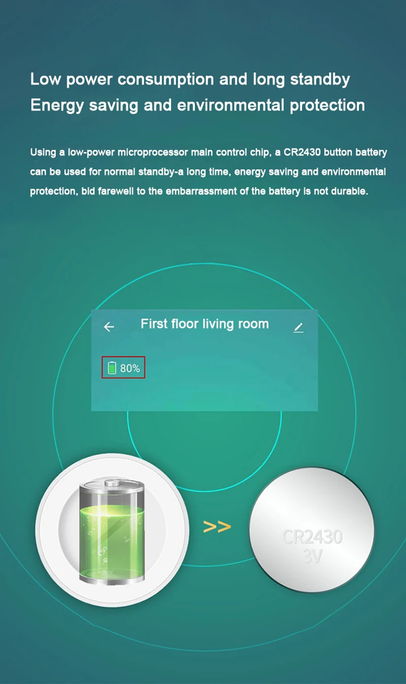 Using a low-power microprocessor maln control chip,a CR2430 buton battery can be used for normal standby-a long time, energy saving and envlronmental protection, bid farewell to the embarrassment of the battery is not durable.