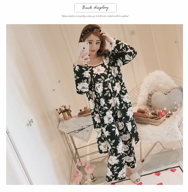 Женский пижамный комплект из 3 предметов, пижама с цветочным принтом, осенняя Женская одежда, топ на бретельках, штаны, длинный халат, пижамные комплекты, одежда для сна, костюм