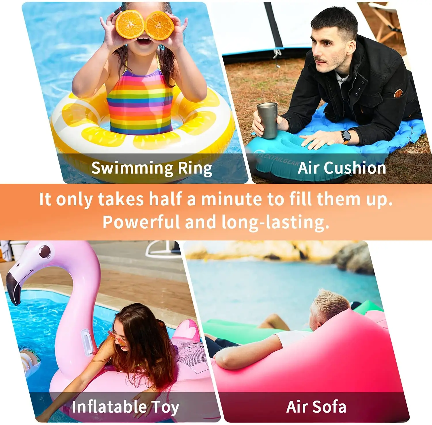 4. Широкое применение: мини-насос является мощным надувающим и сдувающим устройством, особенно для путешествий и активного отдыха. Это поможет вам сэкономить время, накачивая большие надувные лодки, надувные лодки для бассейна, диван, воздушные матрасы, воздушные кровати, надувные лодки, надувная мебель, кольца для плавания, спальные площадки и многое другое.