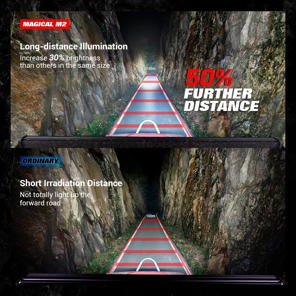 2. Подлинная яркость-покупайте на MICTUNING, вы получаете безопасность! Магический светильник M2 42 дюйма 240 Вт производит 16840LM выход, на 30% намного ярче, чем другие в том же размере. И двухрядная Конструкция с более концентрированным пучком, который увеличивает расстояние освещения около 50%, обеспечивает четкое видимость объектов на дальнейшем расстоянии. Наслаждайтесь безопасной ездой ночью.