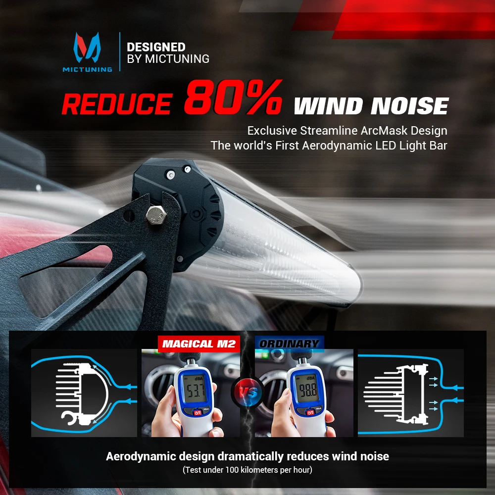 1. Аэродинамический светодиодный светильник-пионер в мире, разработанный в США, патент в ожидании магического M2 аэродинамический светодиодный светильник бар принять эксклюзивный обтекаемый дизайн ArcMask, значительно уменьшает шум ветра, добавляя агрессивный и роскошный вид вашему автомобилю. Благодаря практическим испытаниям шум ветра снижается на 80%. Теперь вы можете держать нормальный разговор и слушать радио во время вождения на высокой скорости.