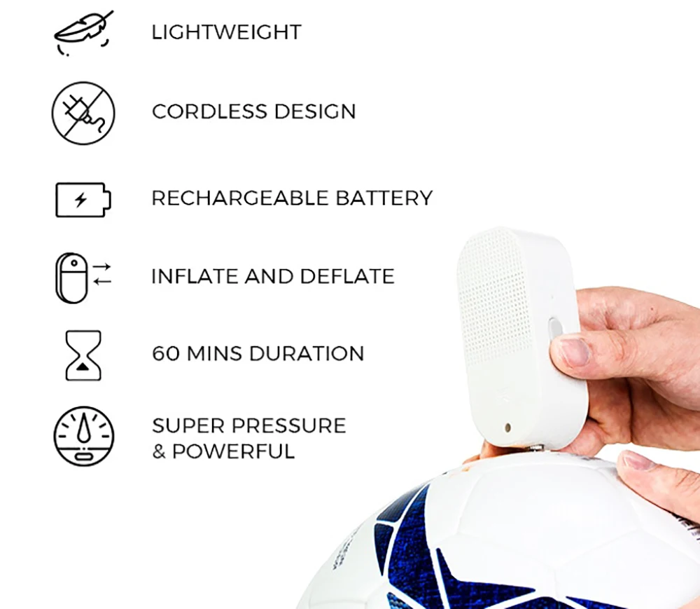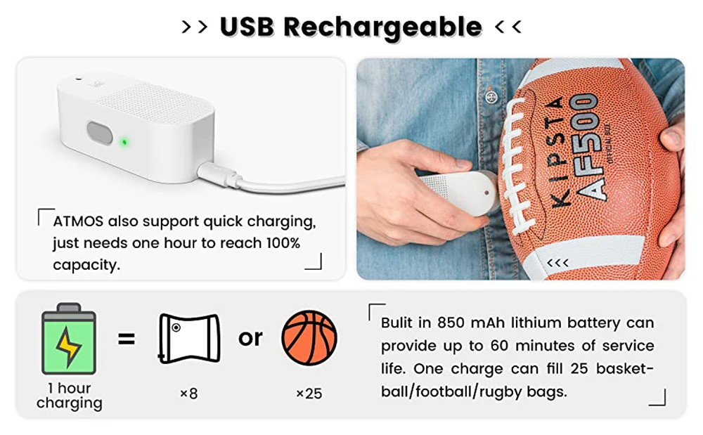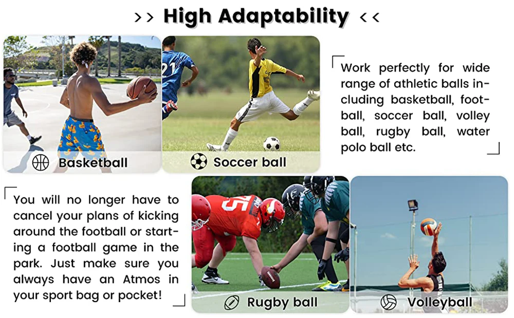С Atmos, попадание воздуха в шарики для увеличения давления воздуха настолько удобно, быстро и легко! Вам больше не придется отменять ваши планы по бегу по футболу или запуску футбольной игры в парке. Просто убедитесь, что у вас всегда есть Atmos в спортивной сумке или кармане!