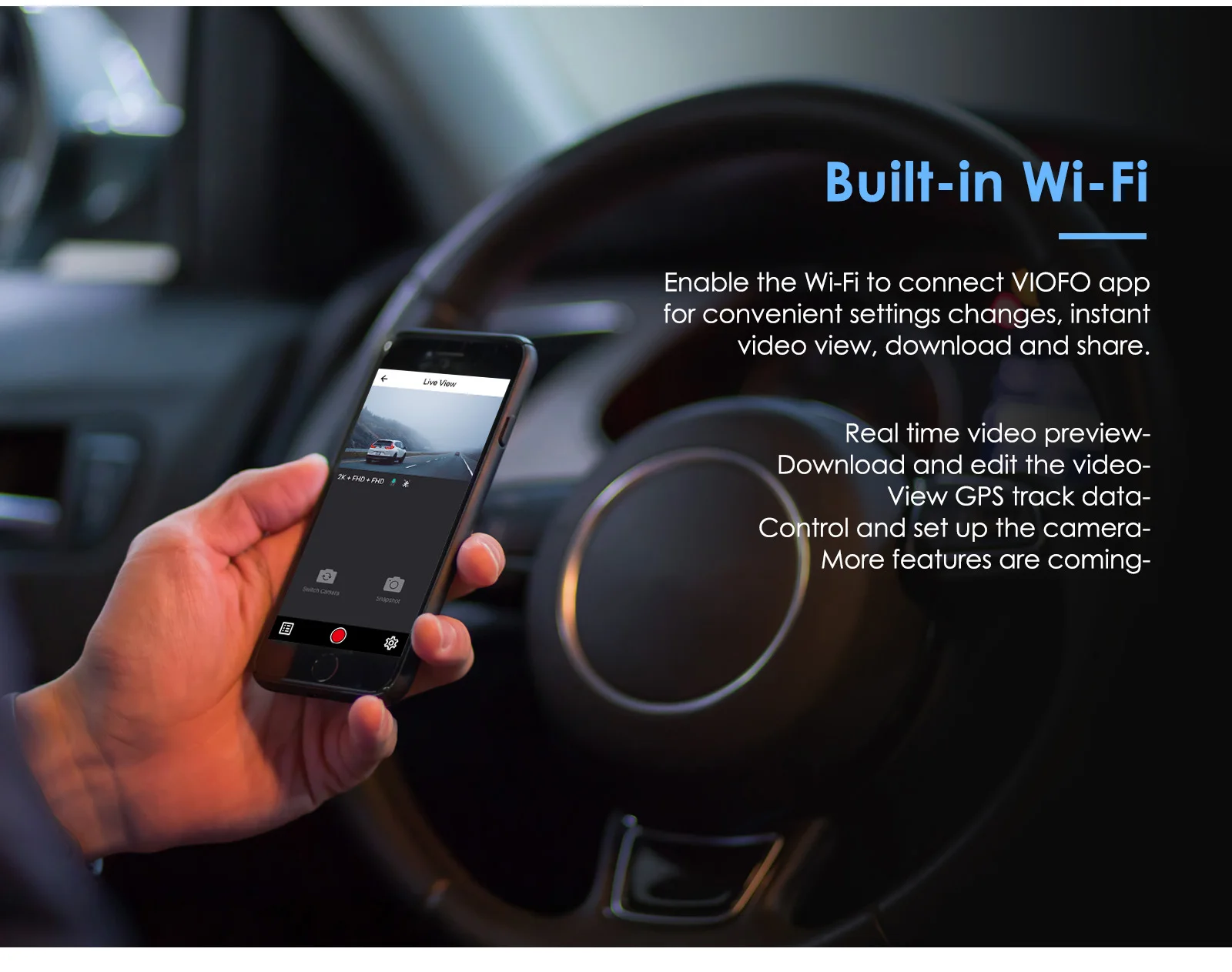 Enable the Wi-Fi to connect VIOFO app for convenient settings changes, instant video view, download and share.