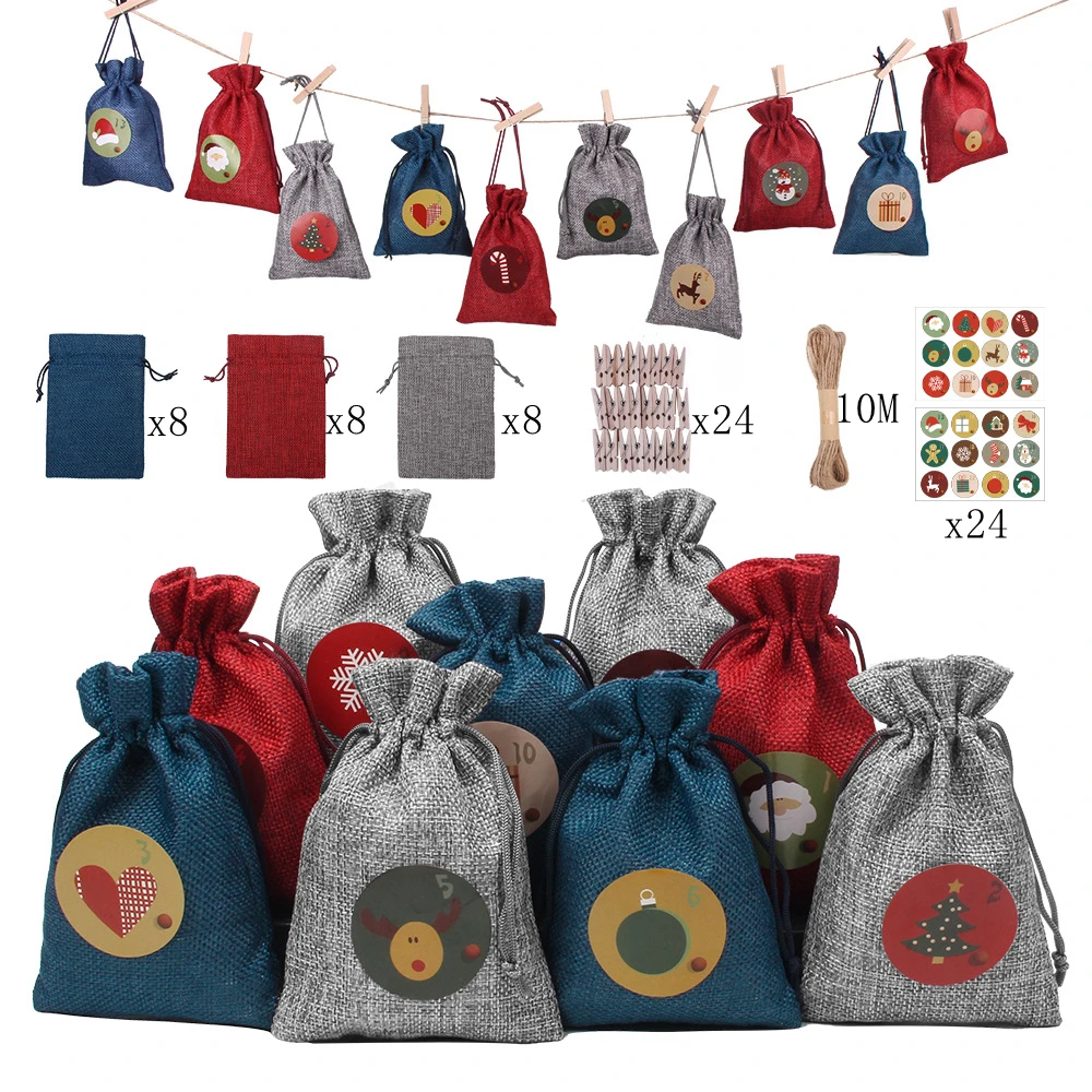 ☆ 24 шт. льняной мешок + 24 шт. деревянные украшения + 24 шт. деревянный зажим + 1 шт. 1 м пеньковая веревка
