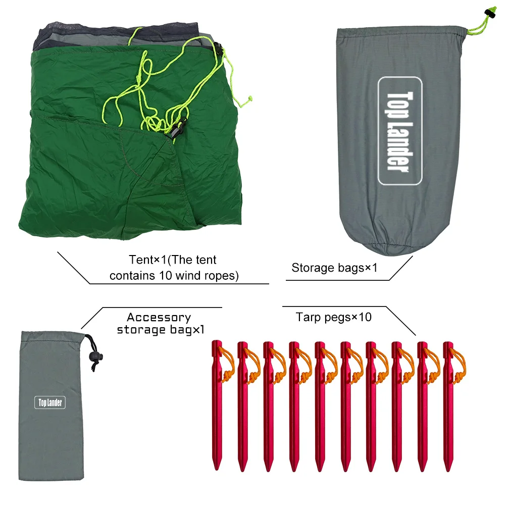 Аксессуары: 10 колышков, 10 канатов (предварительно привязанных на палатке)