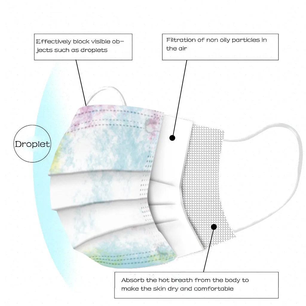3 слоя Нетканая одноразовая маска изготовлена из 3 слоев нетканого материала, он безопасен для здоровья и безопасный для вас, чтобы использовать. Дышащий материал и милые узоры, что делает его полезным и модным. Специальный 3 слоя из нетканого материала, дизайн, обеспечивает некоторые меры защиты от пыли, автомобильный отходящий газ, пыльцу и т. Д. Эластичная петля уха позволяет легко снимать и надевать цепочку и не давит на уши. Маникюрный салон или любые другие области, где может потребоваться защита