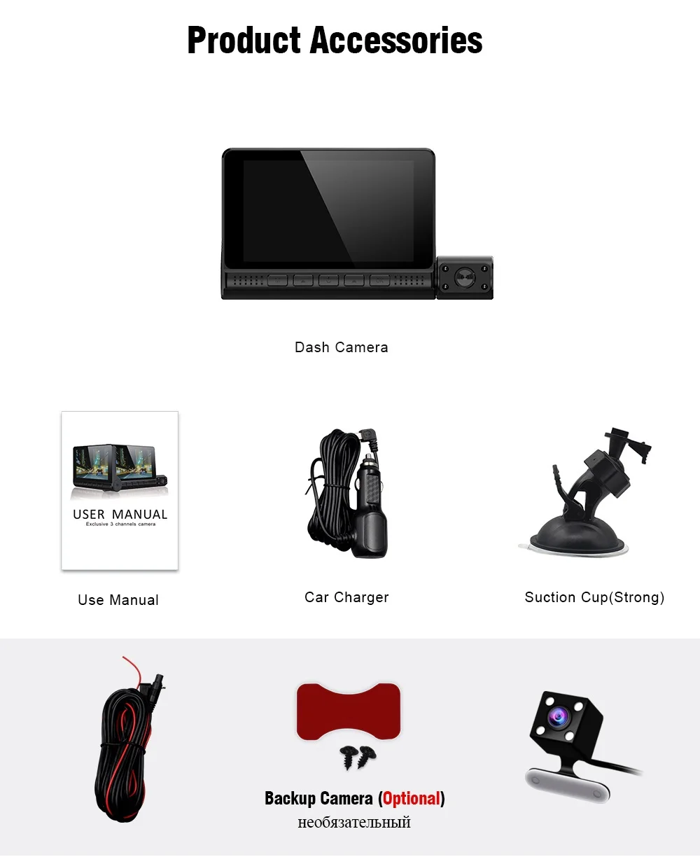 Основные:Упаковочная коробка-1 шт. видеорегистратор-1 шт. зарядное устройство-1 шт. руководство пользователя-1 шт.1 x держатель1 x камера заднего вида с кабелем 6 метров(Опционально)