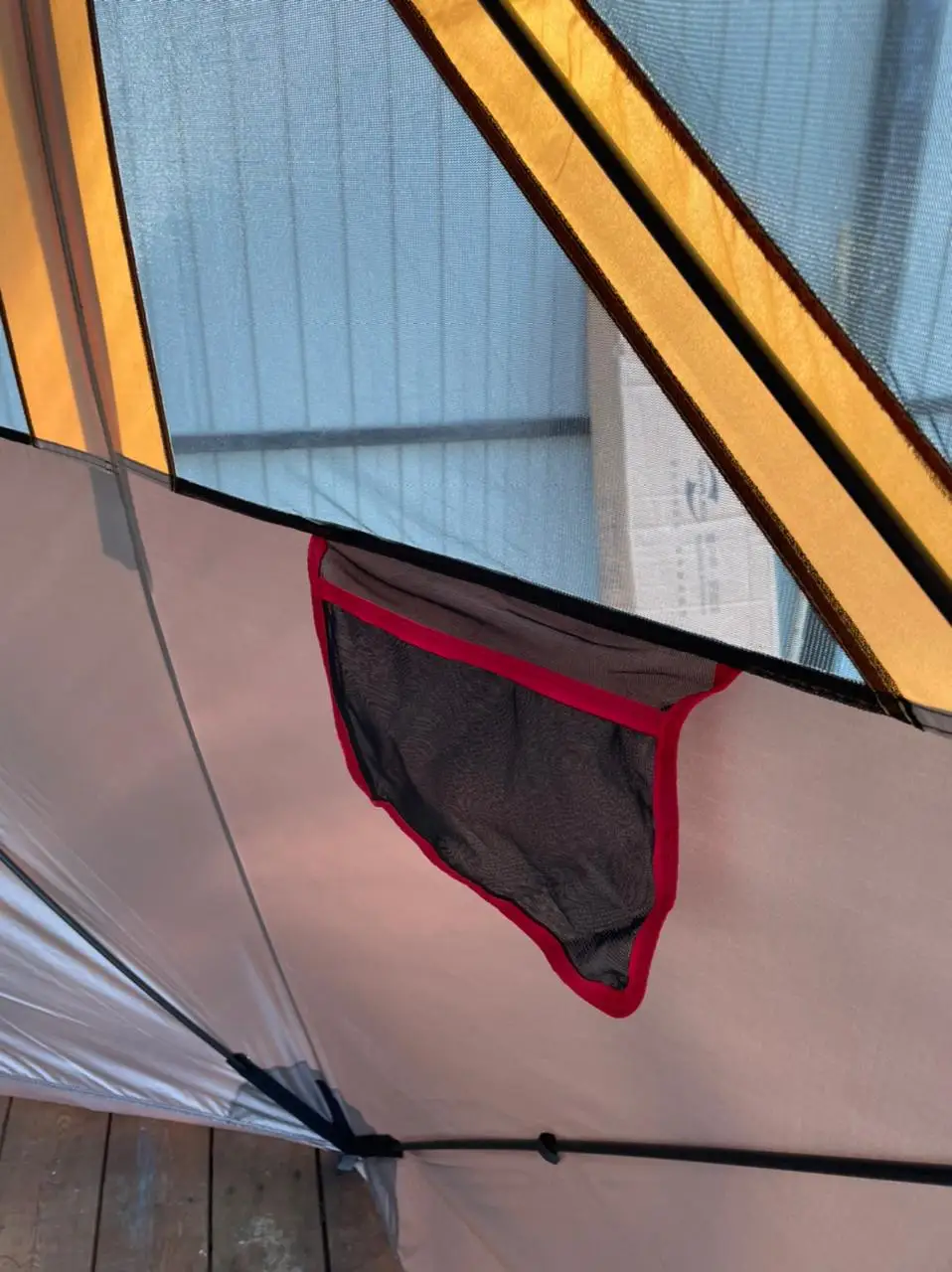 На входе шатра москитная сетка, пол палатки съемный (на липучках), под куполом имеется система для размещения походной лампы. Шатер