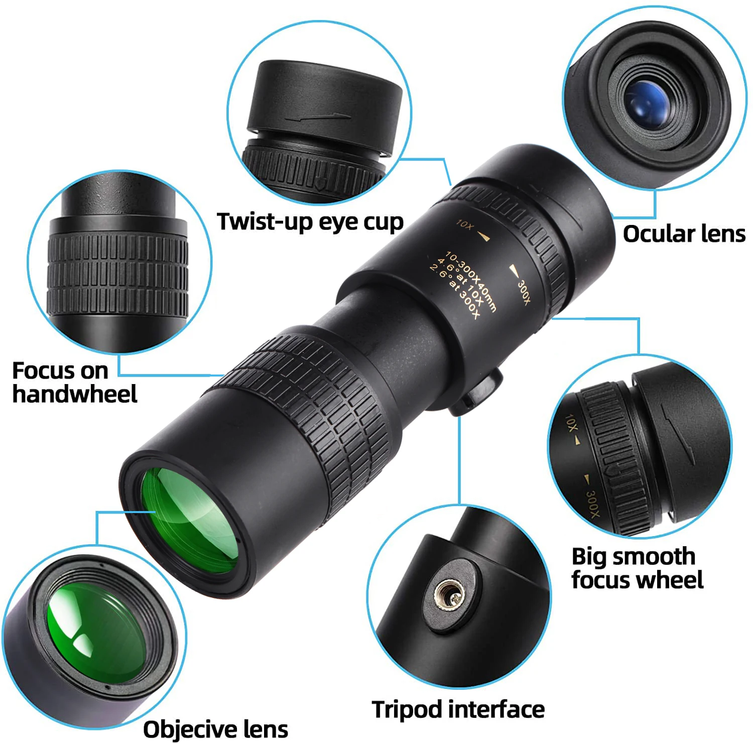 ❤③ 4K 10-300x40mm HD Высокая мощность 】: Модернизированный 10X до 30X увеличение, обеспечивает более широкую, более четкую и яркую сцену в ваших глазах. Отрегулируйте увеличение этого монокуляра зума в соответствии с вашими потребностями, это даст вам визуальную точность, чтобы увидеть чудесный мир.