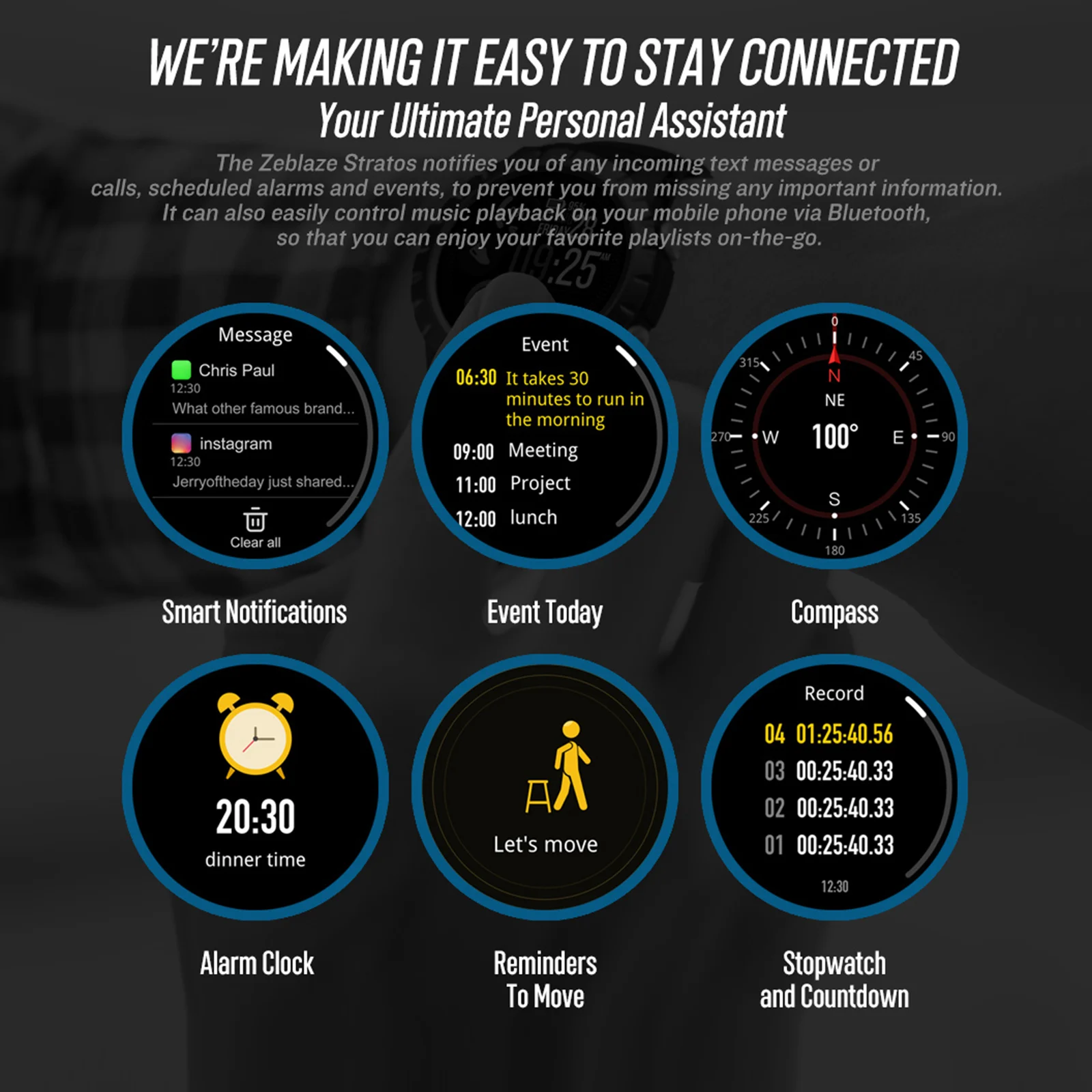Календарь, управление музыкой, поиск моего телефона, напоминание о сидячем положении, будильник, секундомер, обратный отсчет, компас, Время восхода/заката и т. д.