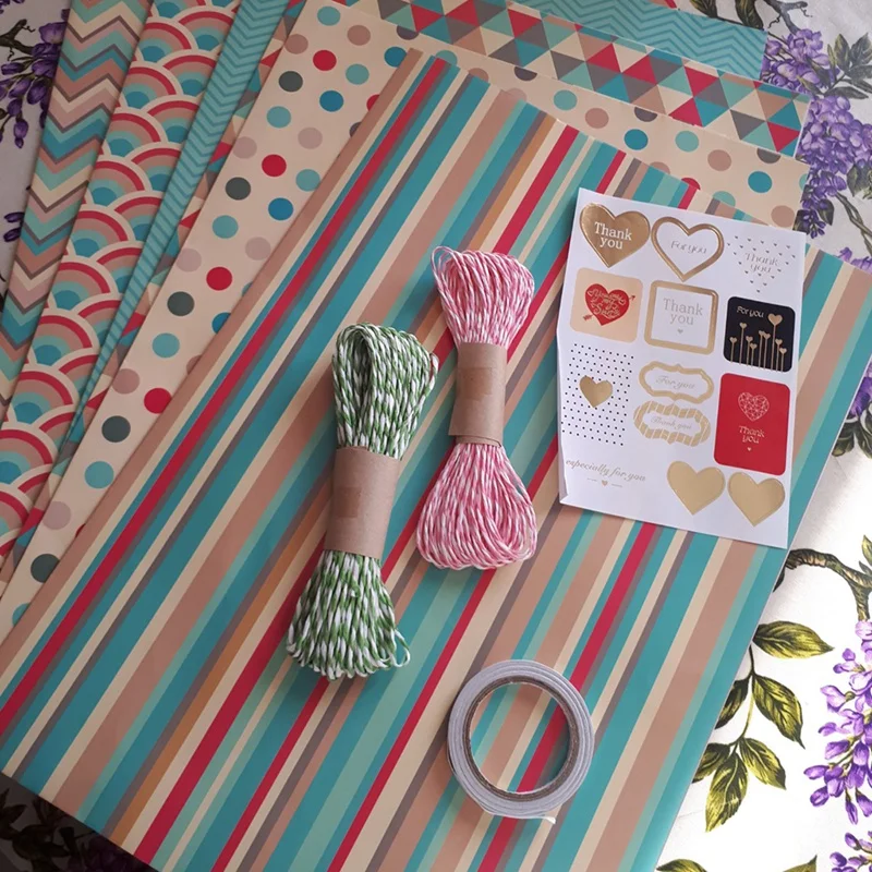 [Набор для упаковки подарков] включает в себя 20 предметов, 12 листов оберточной бумаги в 6 различных дизайнах + 2 наклейки на подарочные бирки + 4 цветных веревки + 2 двухсторонних ленты. Каждая бумага размером 70 см х 50 см, может удовлетворить разные размеры подарочной упаковки, идеальное сочетание для упаковки подарков.