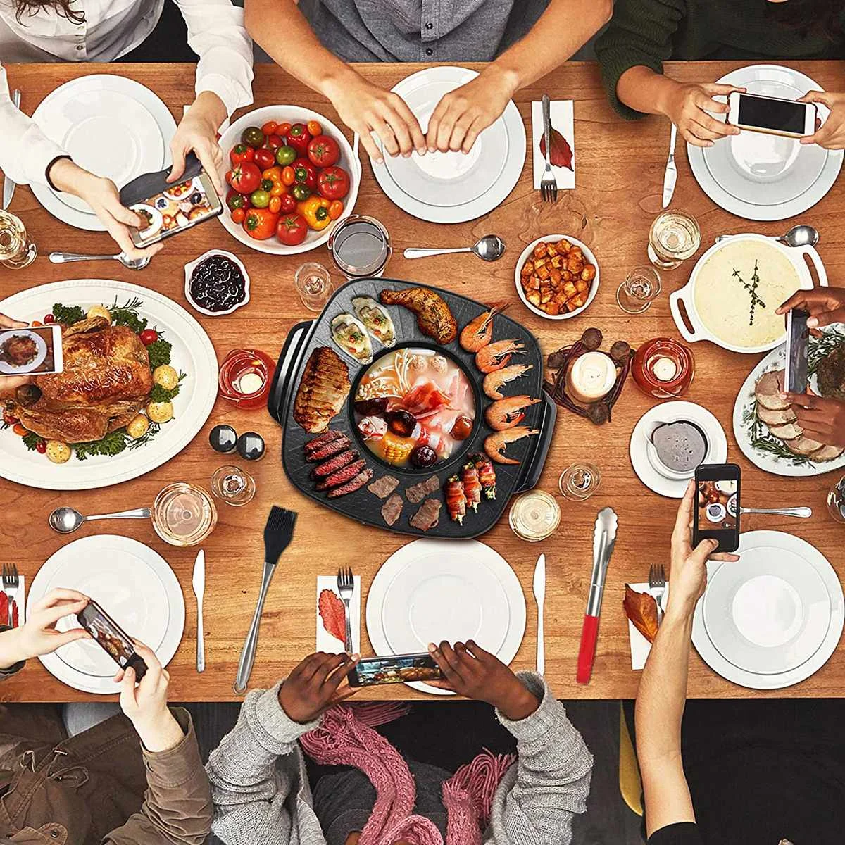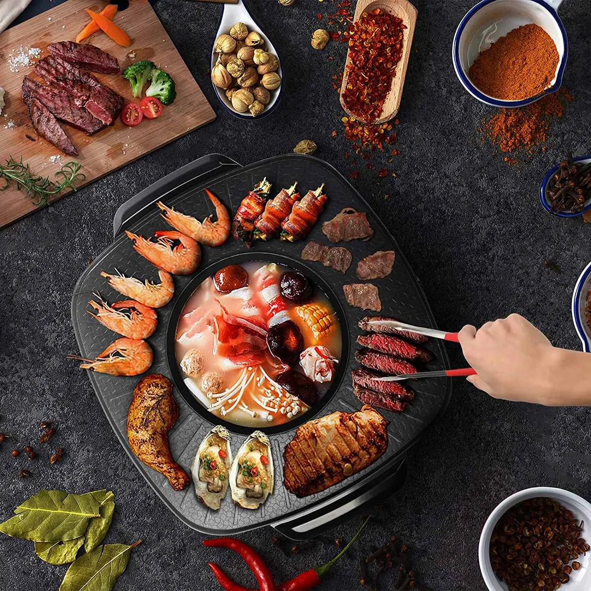 -2 в 1 комбинация барбекю и горячего горшка имеет две ручки контроля температуры. Температура выпечки и горячего горшка контролируются независимо и не мешают друг другу. Поэтому его можно использовать отдельно в качестве сковороды для барбекю в помещении; Его также можно использовать отдельно в качестве горячего горшка.