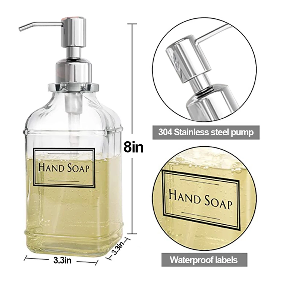 300/550ml Soap Dispenser Antique Thick Glass Hand Soap Dispenser Stainless Steel Pump with 4Pcs Clear Labels