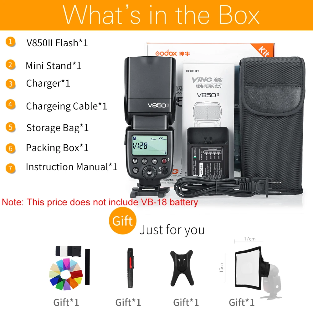 Посылка:1 x вспышка Godox V850IIЗарядное устройство-1 шт.1 мини-подставкаЗащитный чехол-1 шт.1x Бесплатный подарочный набор