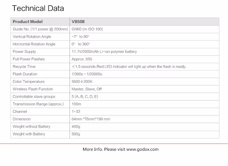 Спецификация:Модель: V850IIНаправляющий номер (мощность 1/1, 200 мм):GN60(m ISO 100)Вертикальный угол вращения: от-7 до 90 °Угол горизонтального вращения: от 0 до 360 °Батарея Ёмкость: 11,1 V/2000 мА/ч, литий-ионный аккумулятор Батарея.Время зарядки: 2,5 часов с AC зарядное устройство/4 часа с автомобильным зарядным устройствомВспышка полной мощности: прибл. 650Время рециркуляции:<1.5s, красный светодиодный индикатор будет светильник, когда вспышка будет готова.Продолжительность вспышки: прибл. 1/300s-1/20000sЦветовая температура: 5600K +-200KФункция беспроводной вспышки: Master,Slave,OffУправляемая подчиненная Группа: 5 (A,B,C,D,E)Расстояние без косточек: 100 мКанал: 1-32Размер: 64*76*190 ммВес нетто (без батареи):420 гВес брутто: 530 г.