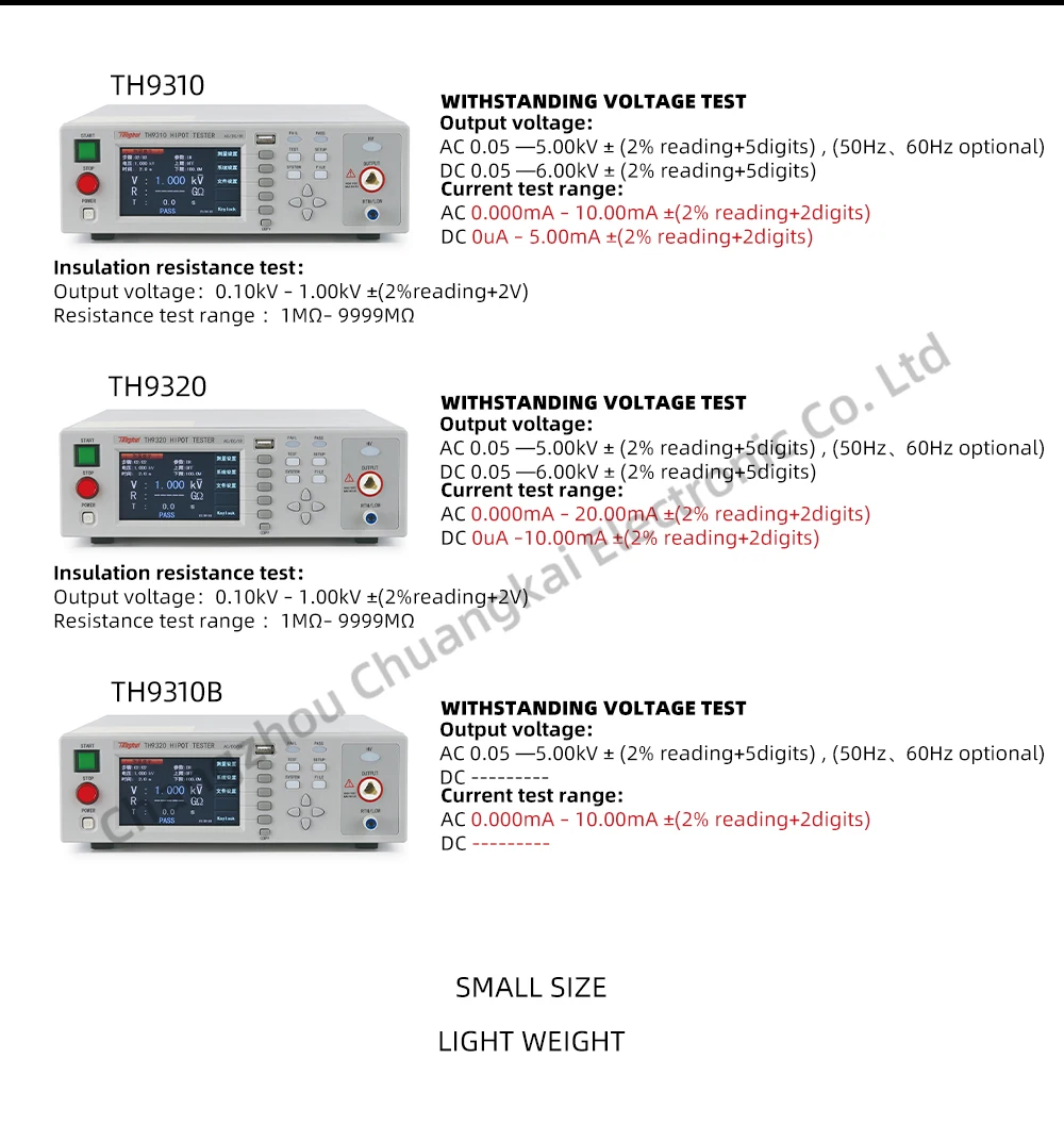 ▪TH9310/20 серия Выдерживает напряжение/Сопротивление изоляции тестер является экономичным и интеллектуальным тестер безопасности с характеристиками небольшого размера, вес светильник, приятный внешний вид и простота в эксплуатации. Серии TH9310/20 могут быть широко использованы в тестах безопасности бытовых приборов, трансформаторов, электрического оборудования и компонентов.