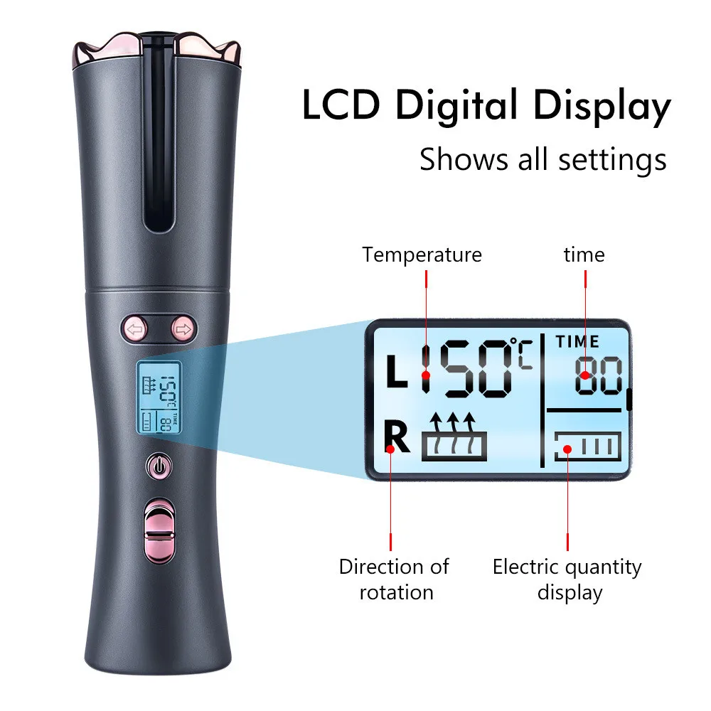 Автоматическая вращающаяся зубчатая Беспроводная перезаряжаемая ЖК-дисплей, Быстрое нагревание, беспроводная волна для укладки волос, Плойка для завивки волос