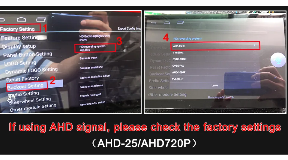 Перейдите к настройкам автомобиля> заводские настройки> Настройки обратного хода (изображение)> Выберите AHD25 Hz