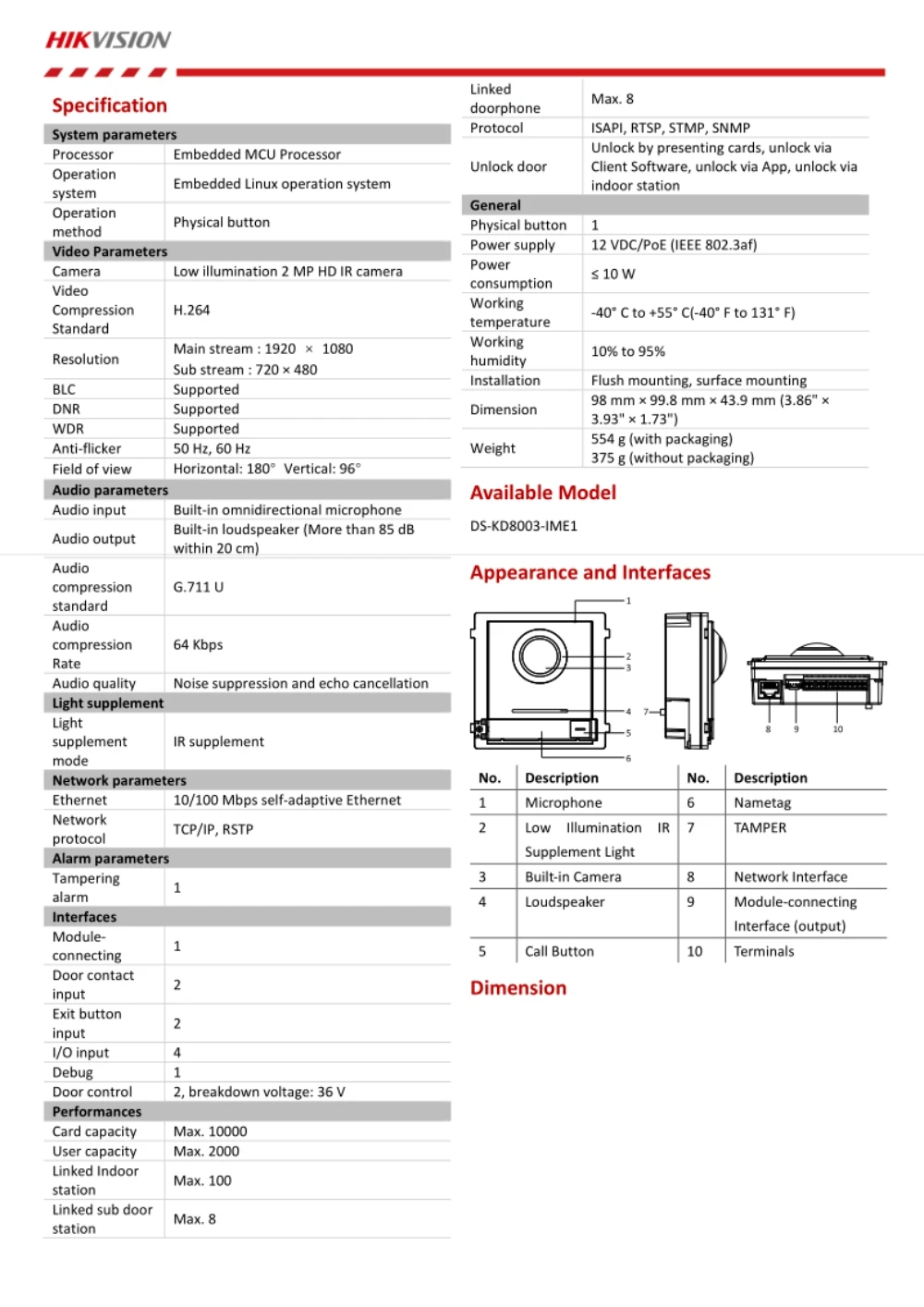 In Stock 2MP HD Colorful Camera, Fish eye, IR Supplement ,Video Intercom To Indoor Station And Master Station DS-KD8003-IME1
