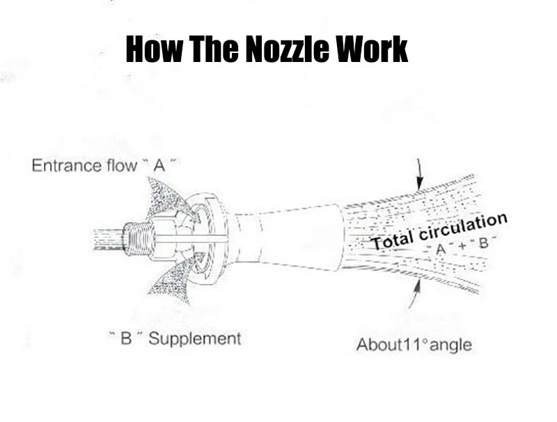 Дополнительный поток жидкости смешивается с накачанным раствором, то есть сопло может вытягивать 4 галлона окружающего раствора на каждый 1 галлон, прокачанный через сопло.