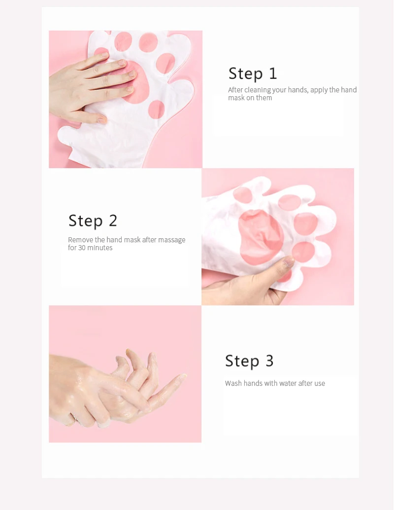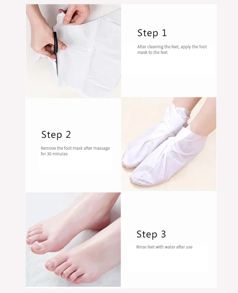 Очистите руки или ноги и высушите их, затем Наденьте маску для рук, чтобы ваши руки были полностью прикреплены к пленке. Нанесите статически в течение 20-40 минут и массируйте обе руки во время использования. Снимите маску для рук или ног, аккуратно массируйте до впитывания, затем снимите краску с воды.