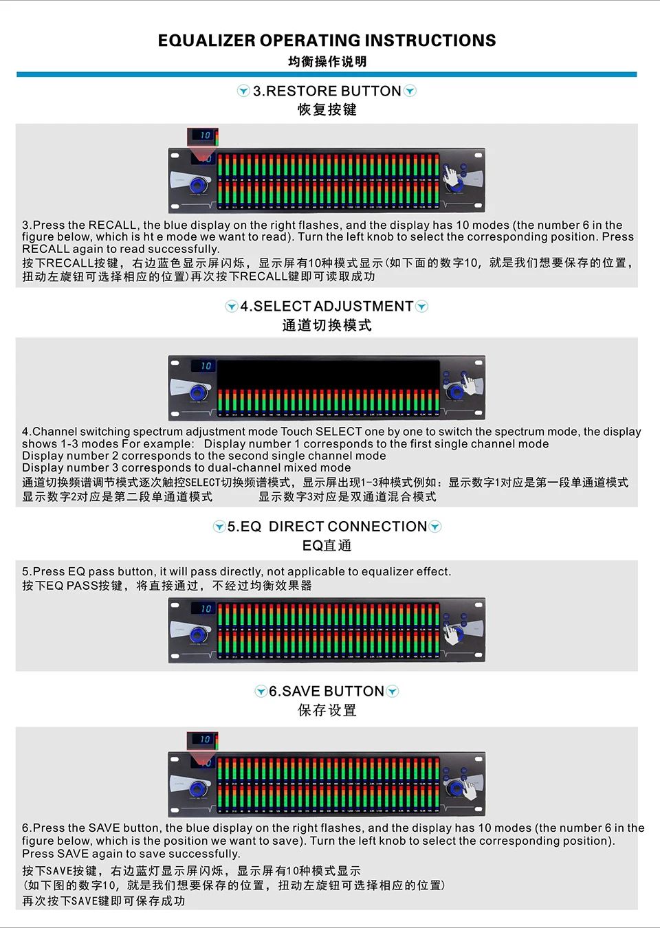 Встроенный чип памяти DSP, вы можете предварительно хранить 10 режимов для вызова. Слегка нажмите кнопку «сохранить», и вы можете повернуть ручку или получить, чтобы выбрать любой режим от 1-10.
