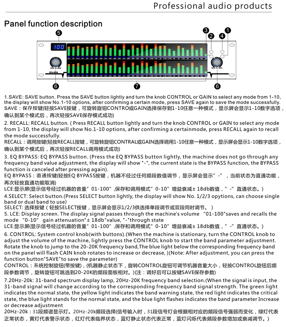 EQ-888 использует инновационные технологии и передовые технологии производства, чтобы создать двойной 31-полосным эквалайзером. Усовершенствованная конструкция цепи и выбор высококачественных компонентов позволяют эквалайзеру легко достичь частотной реакции 10 Гц-50 кГц, Отношение сигнал/шум более 90 дБ, общее гармоническое искажение менее 0.005% и Изоляция канала более 90 дБ.