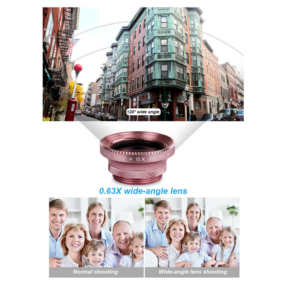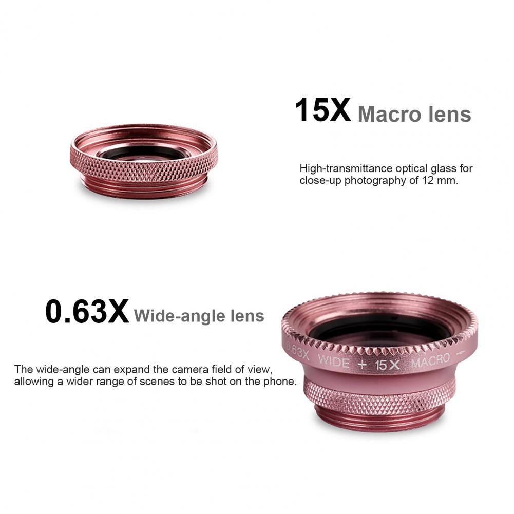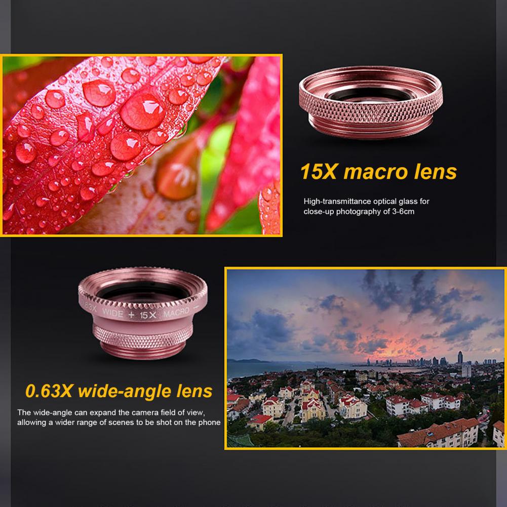 Подходит для 95 процентов смартфонов, iPad и ноутбука. С широкоугольным углом 0.63X, он имеет широкое поле зрения и ультра широкоугольную hd-совместимую съемку, что делает ваш мобильный телефон SLR за одну секунду. Расстояние макросъемки составляет 3-6 см, что позволяет чётко фокусироваться и более гибко осваивать изображение.