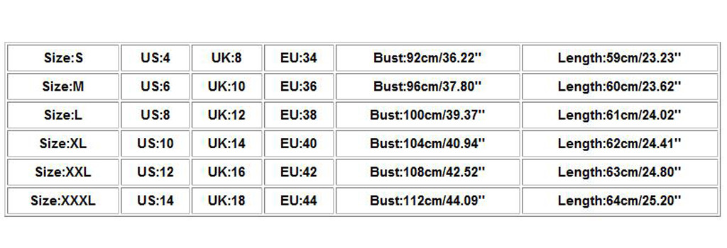 Пожалуйста, сравните детальные размеры с вашими перед покупкой! Цвета могут немного отличаться в зависимости от настроек компьютера и монитора Возможны незначительные отклонения в размере на 1-3 см разницу в размерах ввиду того, что Замеры производились вручную, спасибо (все размеры указаны в см, обратите внимание: 1 см = 0,39 дюйма) Таблица размеров: Размеры США Великобритания ЕС Бюст Длина S 4. 8 34 92 см/36,22'' 59 см/23,23'' М 6 10 36 96 см/37,80'' 60 см/23,62'' L 8 12 38 100 см/39,37'' 61 см/24,02'' XL 10 14 40 104 см/40,94'' 62 см/24,41'' XXL 12 16 42 108 см/42,52'' 63 см/24,80'' XХХL 14 18 44 112 см/44,09'' 64 см/25,20''
