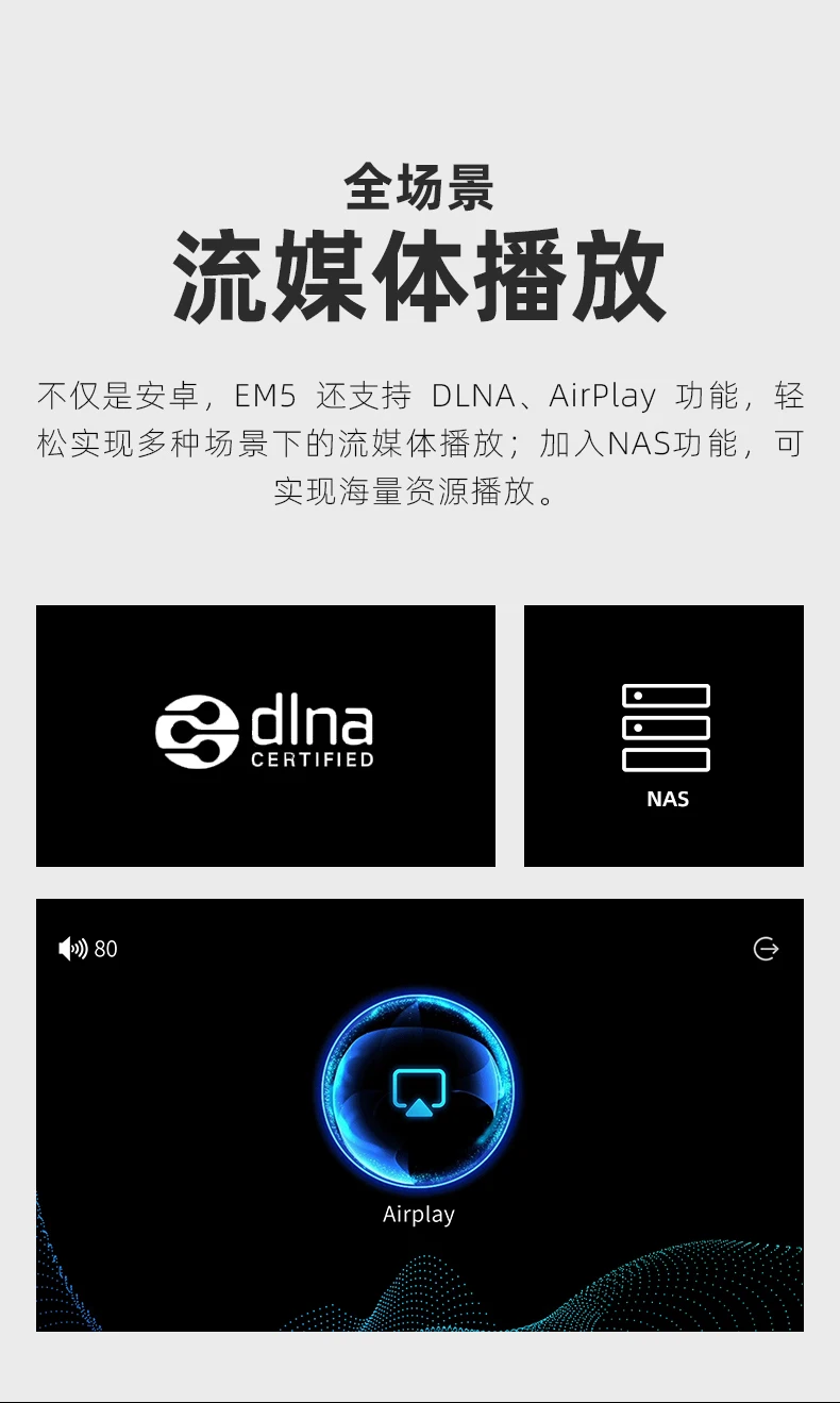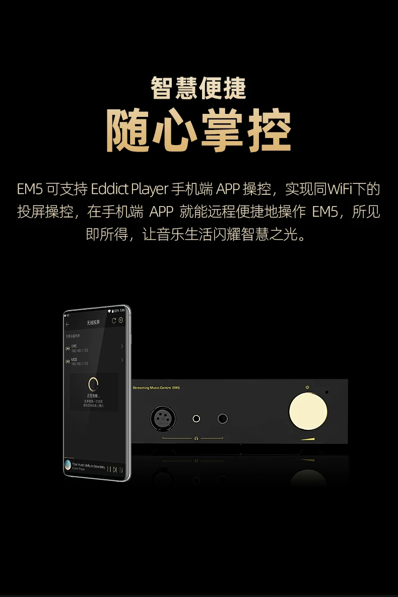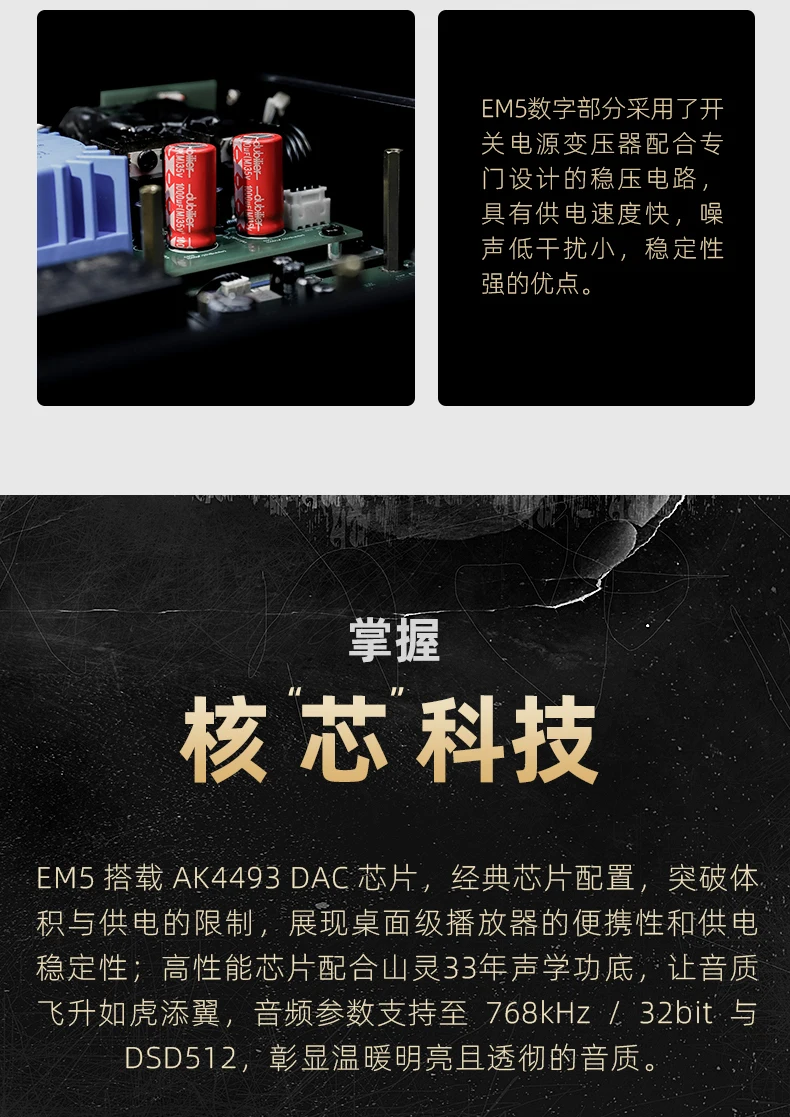 EM5 был разработан как DAC/AMP для высококачественных наушников, с диапазоном различных разъемов, включая сбалансированный XLR и 4,4 мм. Его также можно использовать в качестве DAC и предварительного усилителя в сочетании с отдельным усилителем мощности или активными динамиками.