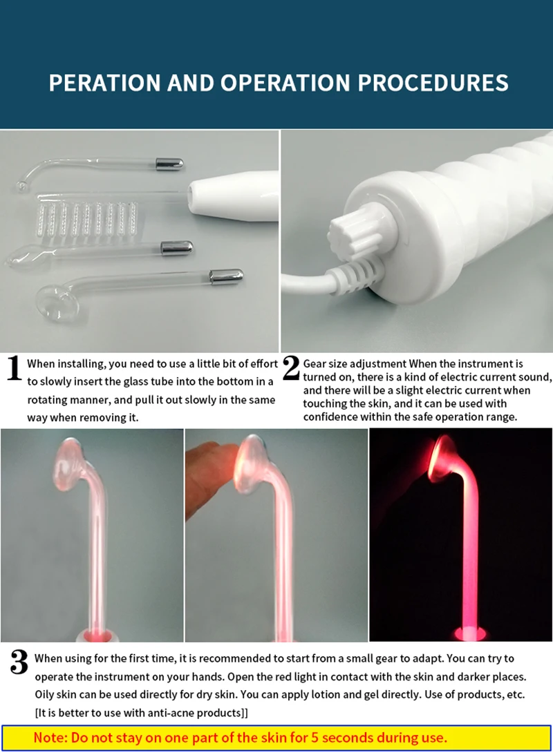 2: Это высокочастотное устройство может спокойно восстанавливать процесс старения и возвращать молодую кожу, Устраняет прыщи и прыщи, помогает рану быстро заживлять, сковывает поры, затягивает кожу, помощь росту волос и лечение алопеции и т. Д.