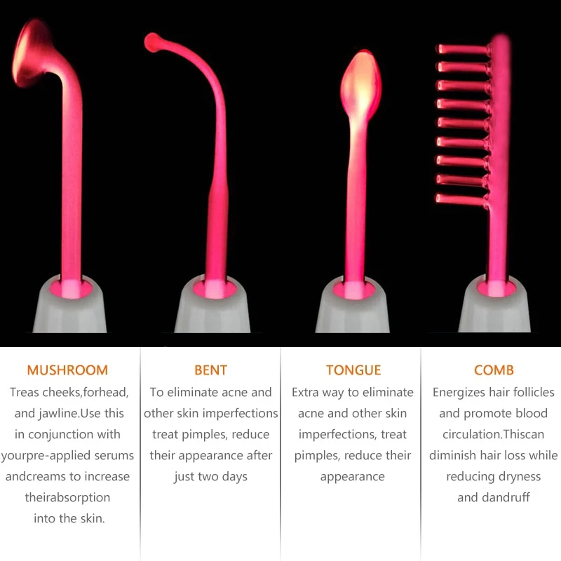 ✅Четыре электрода: вы можете выбрать различные электроды для обработки различных частей тела-грибовидный электрод для обработки широкой области; Электрод крючка для небольших целевых областей; Электрод ложки для области под глазами; расческа электрода для области головы.