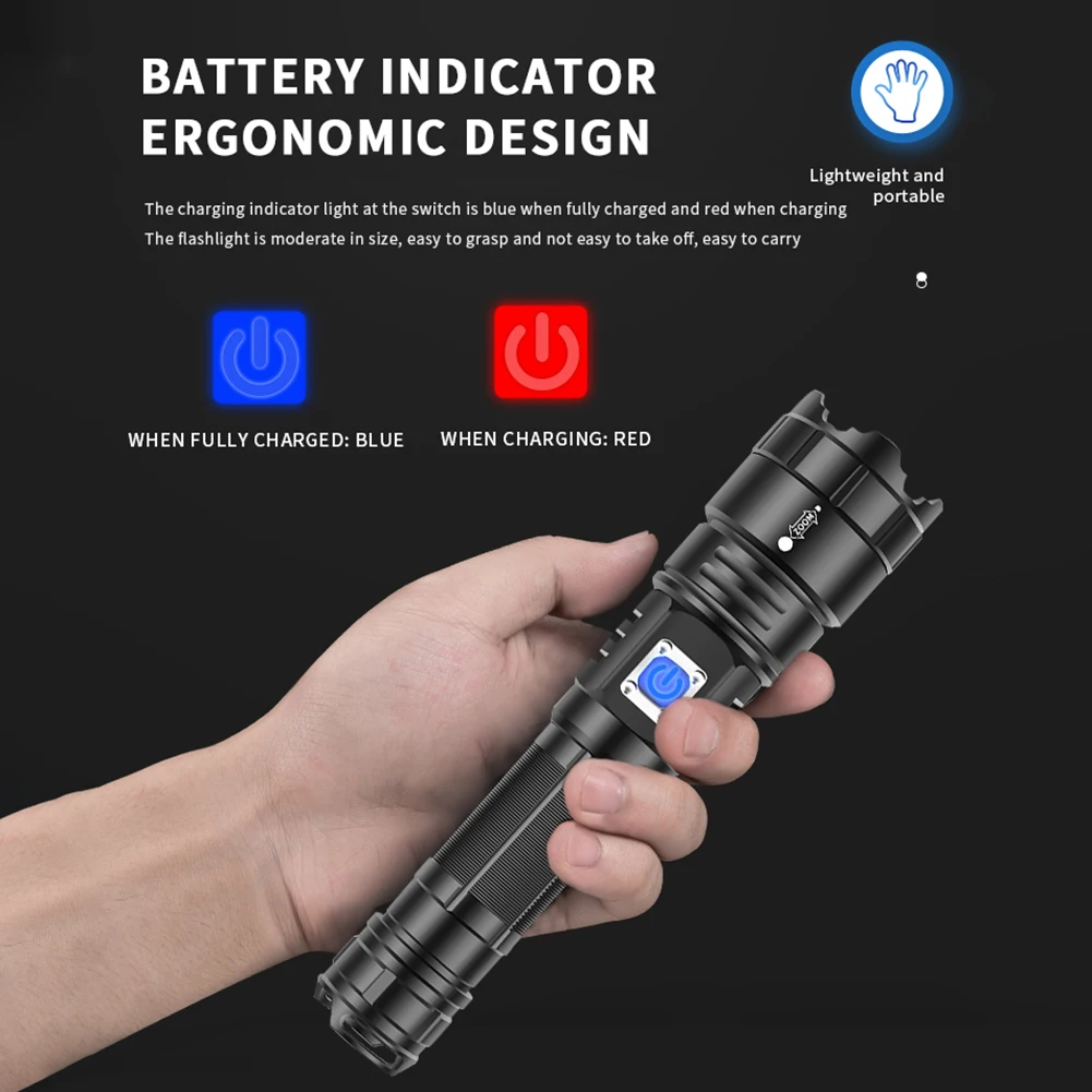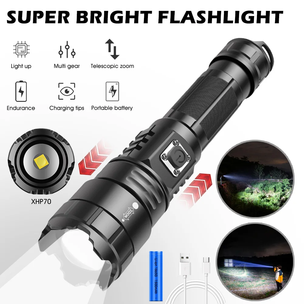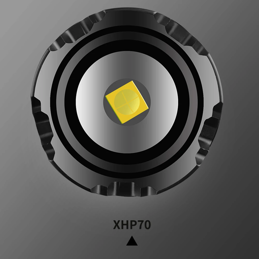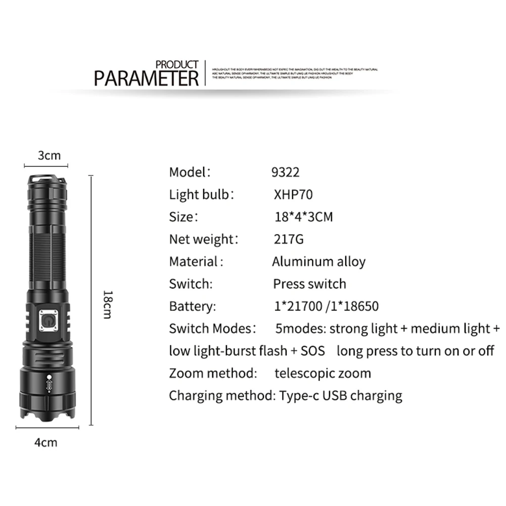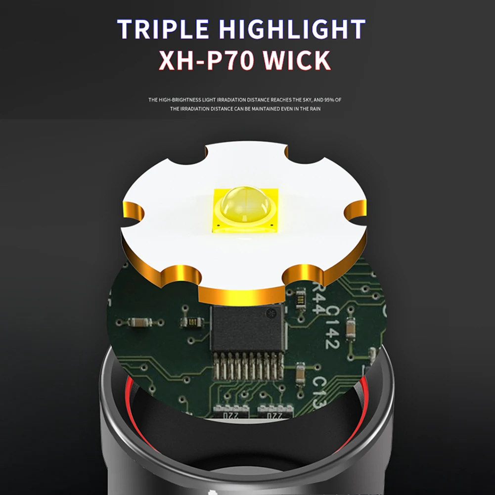 * 1. Этот флеш светильник принимает его последняя XHP70 светодиодный сильный светильник объектив с облучению. Расстояние облучения может достигать 500 м, а срок службы может достигать 120000 часов.