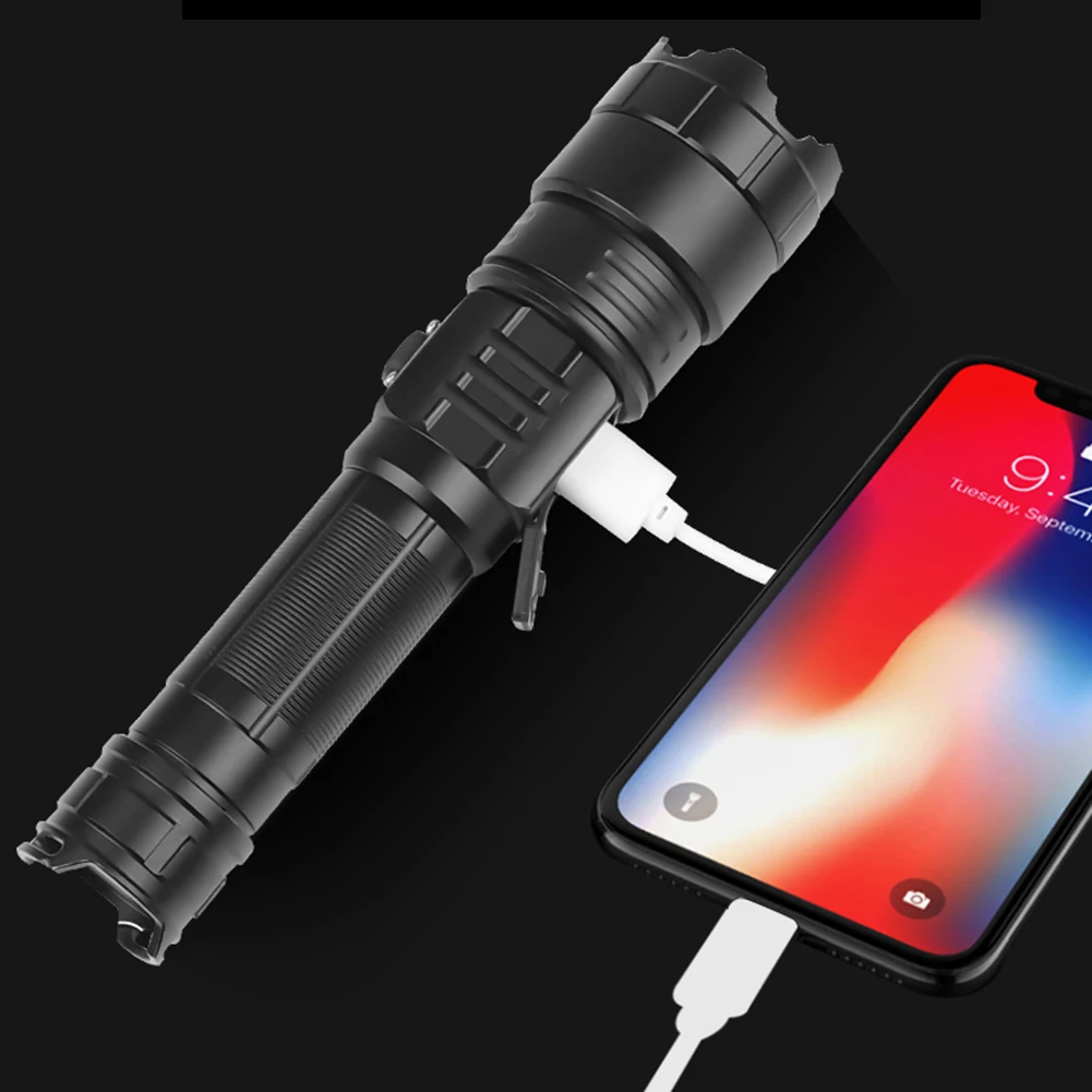 * 2. Фонарь заряжается от USB благодаря встроенным аккумуляторам 18650/27100 (включая аккумуляторы). На выключателе есть светодиодный светильник, поэтому не беспокойтесь о внезапном отключении питания. Кроме того, этот фонарик может использоваться в качестве банка питания, чтобы зарядить мобильный телефон, очень удобно и практично.