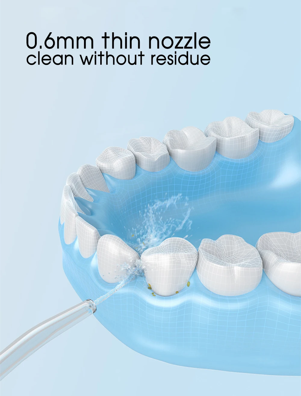 ● Fine water spray, fine to 0.6mm. Let the teeth seams reach 360 degrees of cleaning effect. Allow stubborn stains left in the teeth seams to be completely removed.