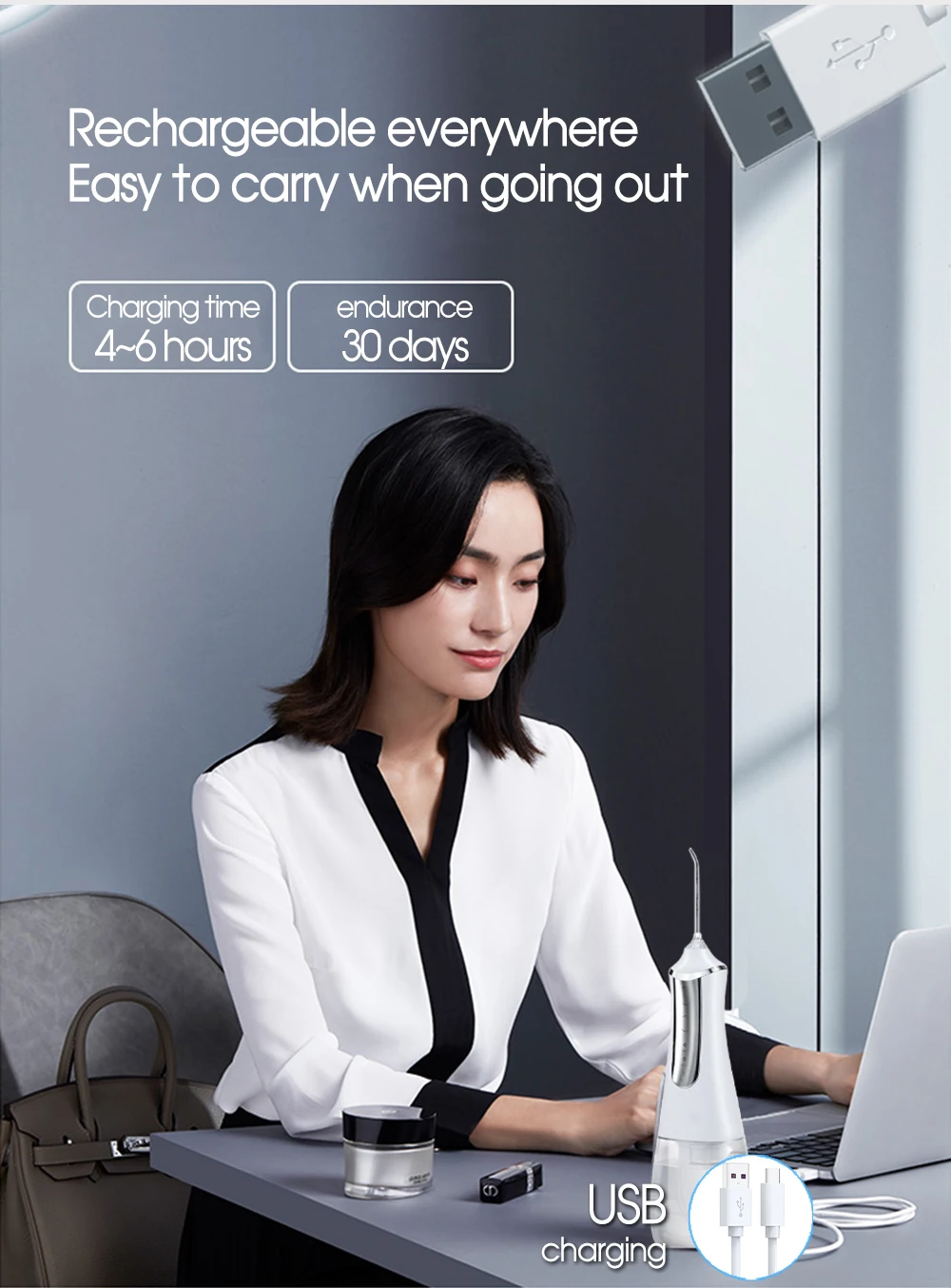 ● When the appliance runs low on power, it can be charged at any location. Plug in usb wire can charge the product at any time, convenient and fast operation.