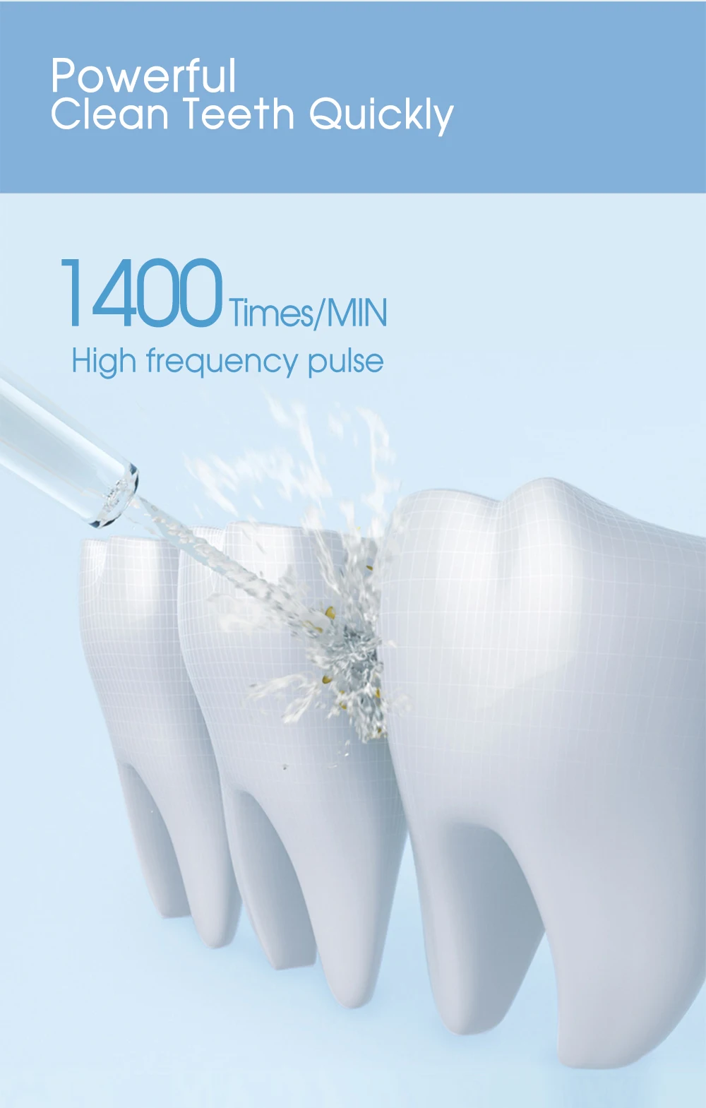 -Interdental massage, clean mouth, strong pulse, and the whole machine is waterproof. Professional care and cleaning, solve a variety of oral problems, clean and no residue between teeth