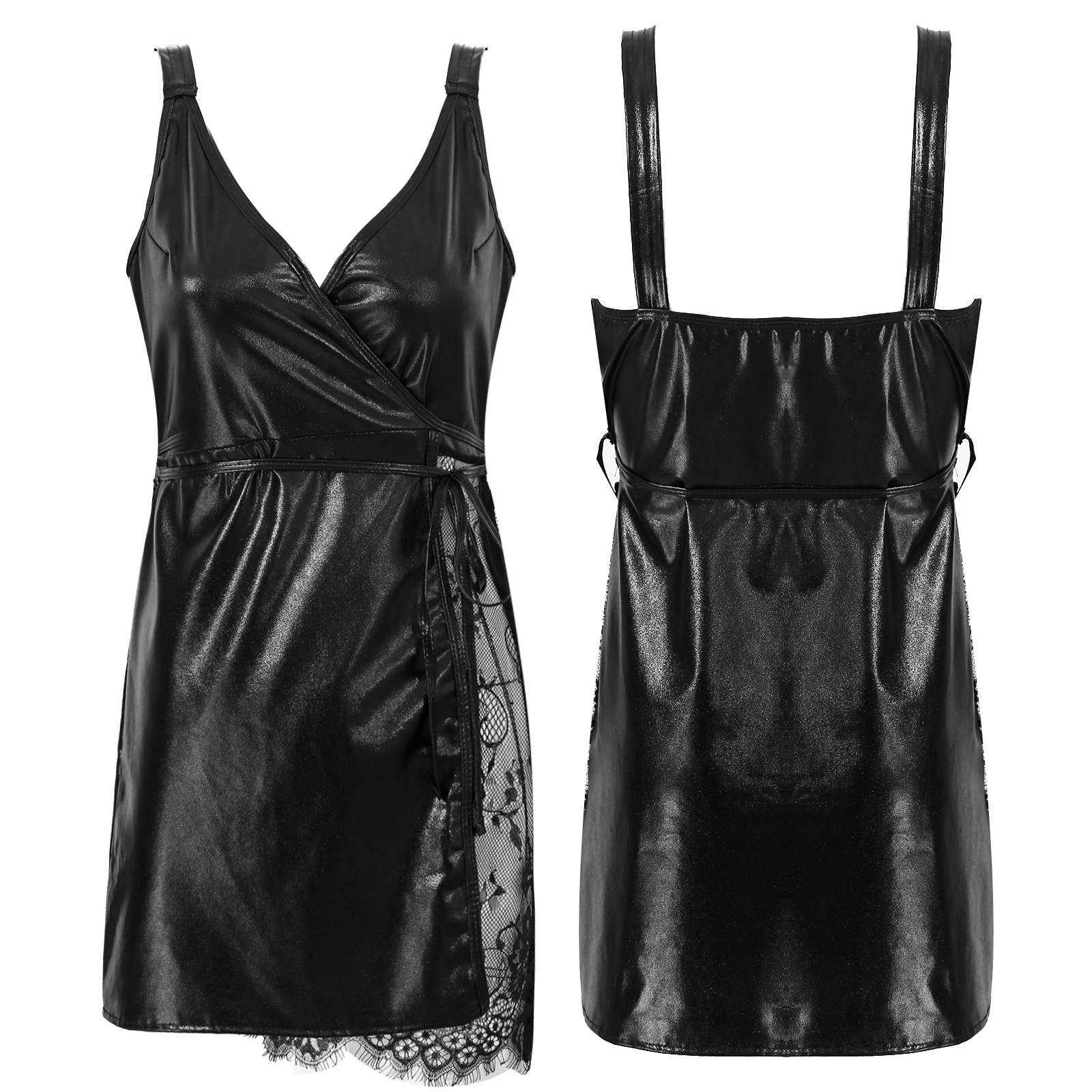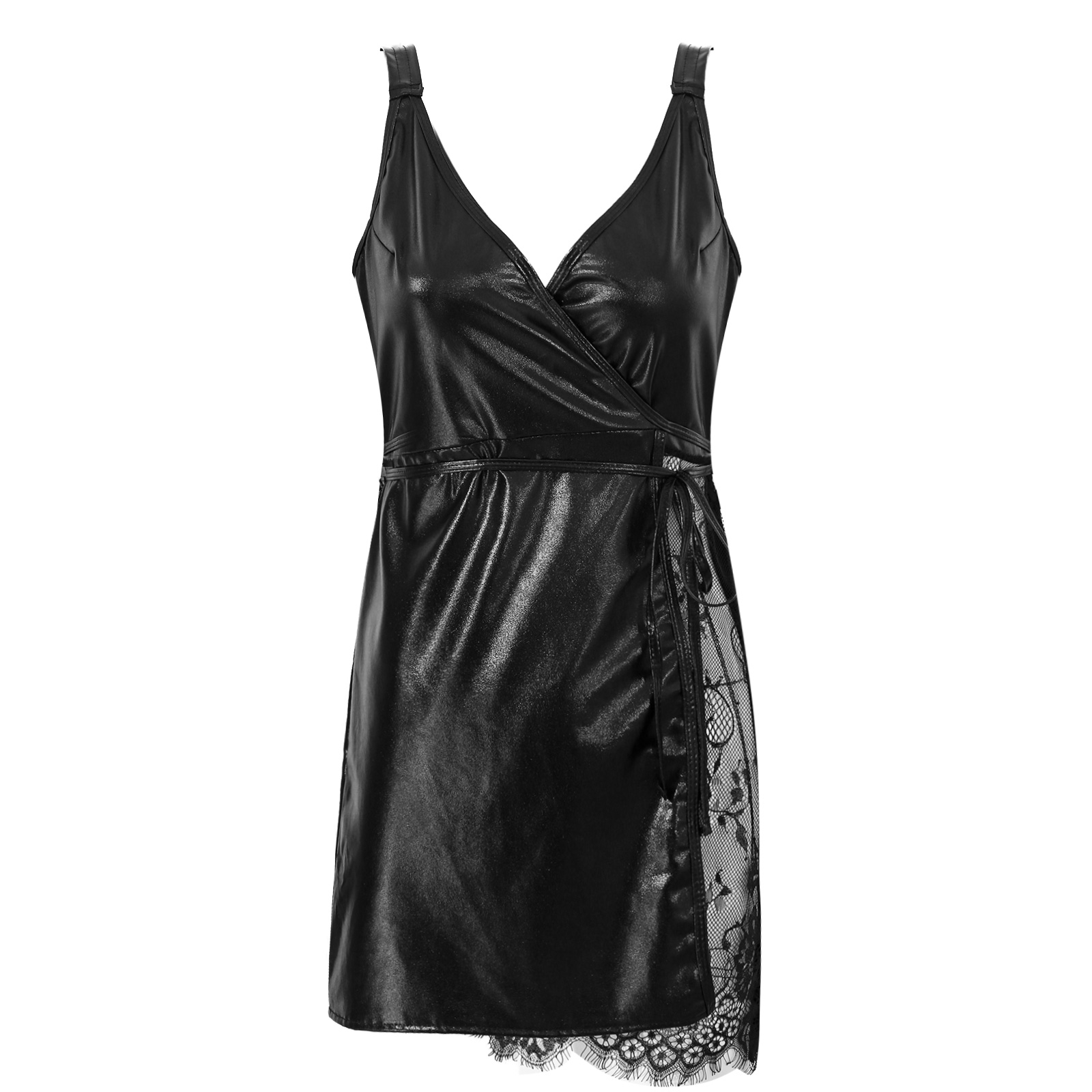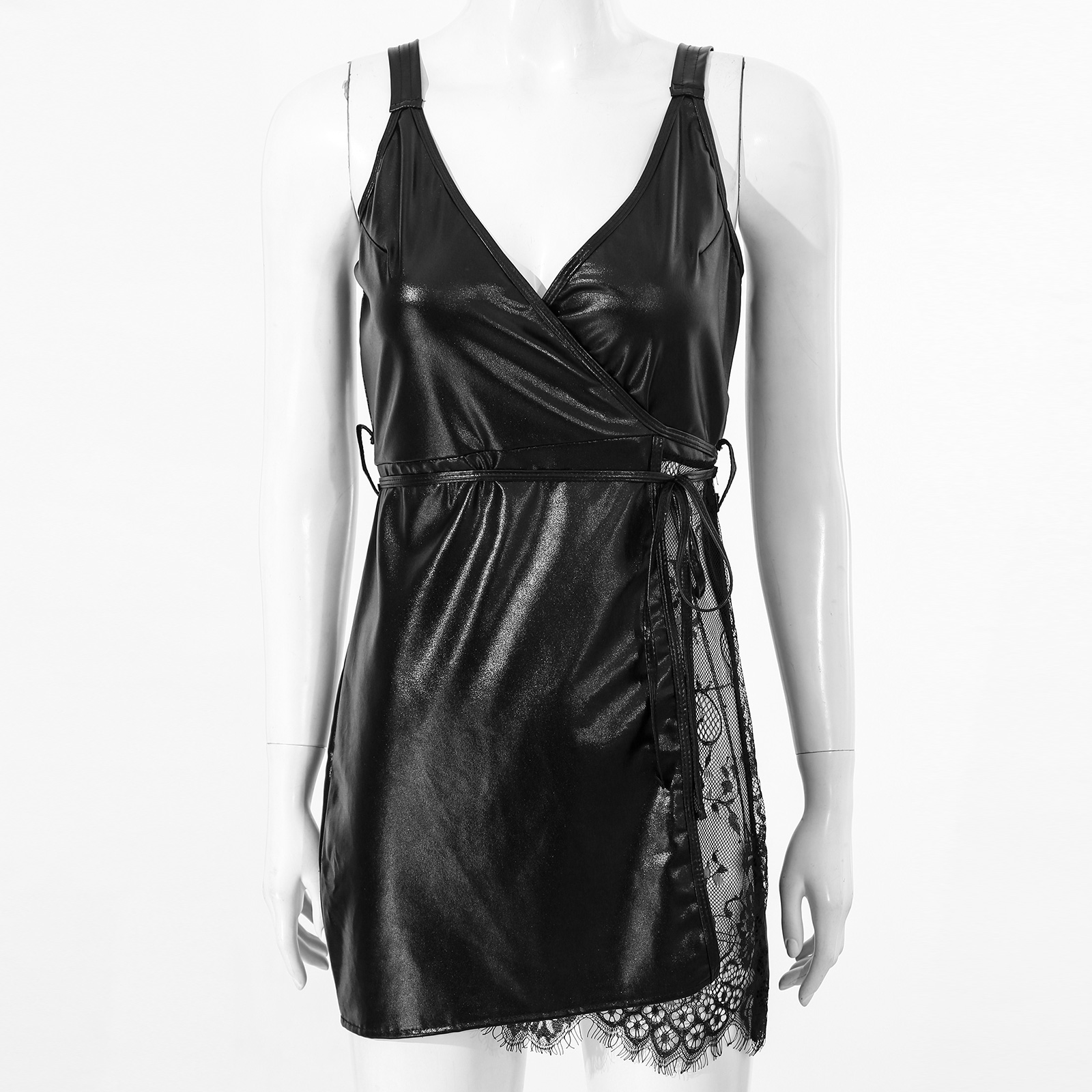 Женское платье из лакированной кожи с v-образным вырезом и широкими лямками, прозрачное кружевное платье с поясом в стиле пэчворк.