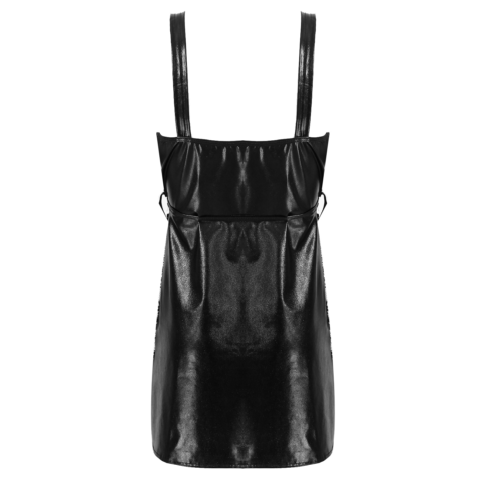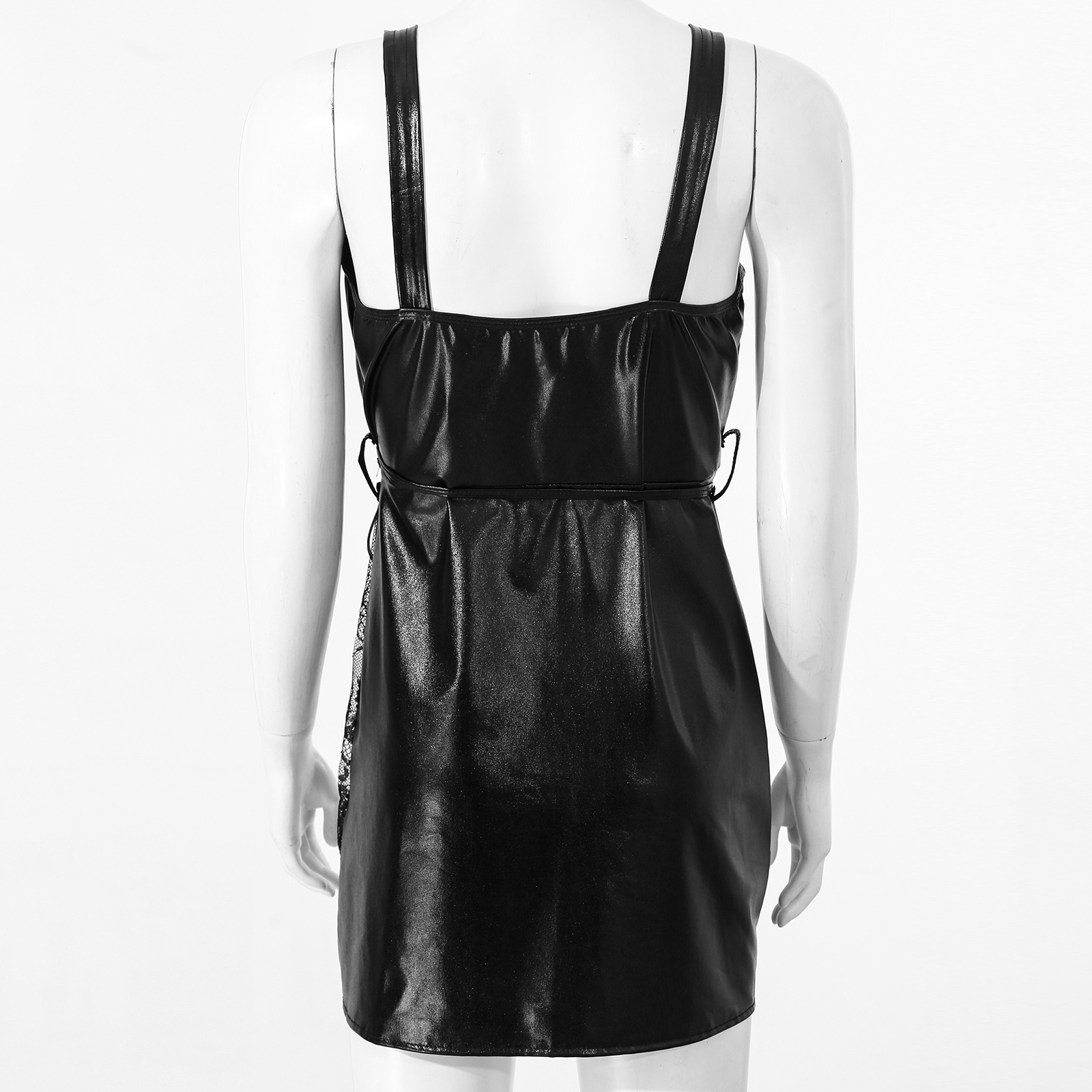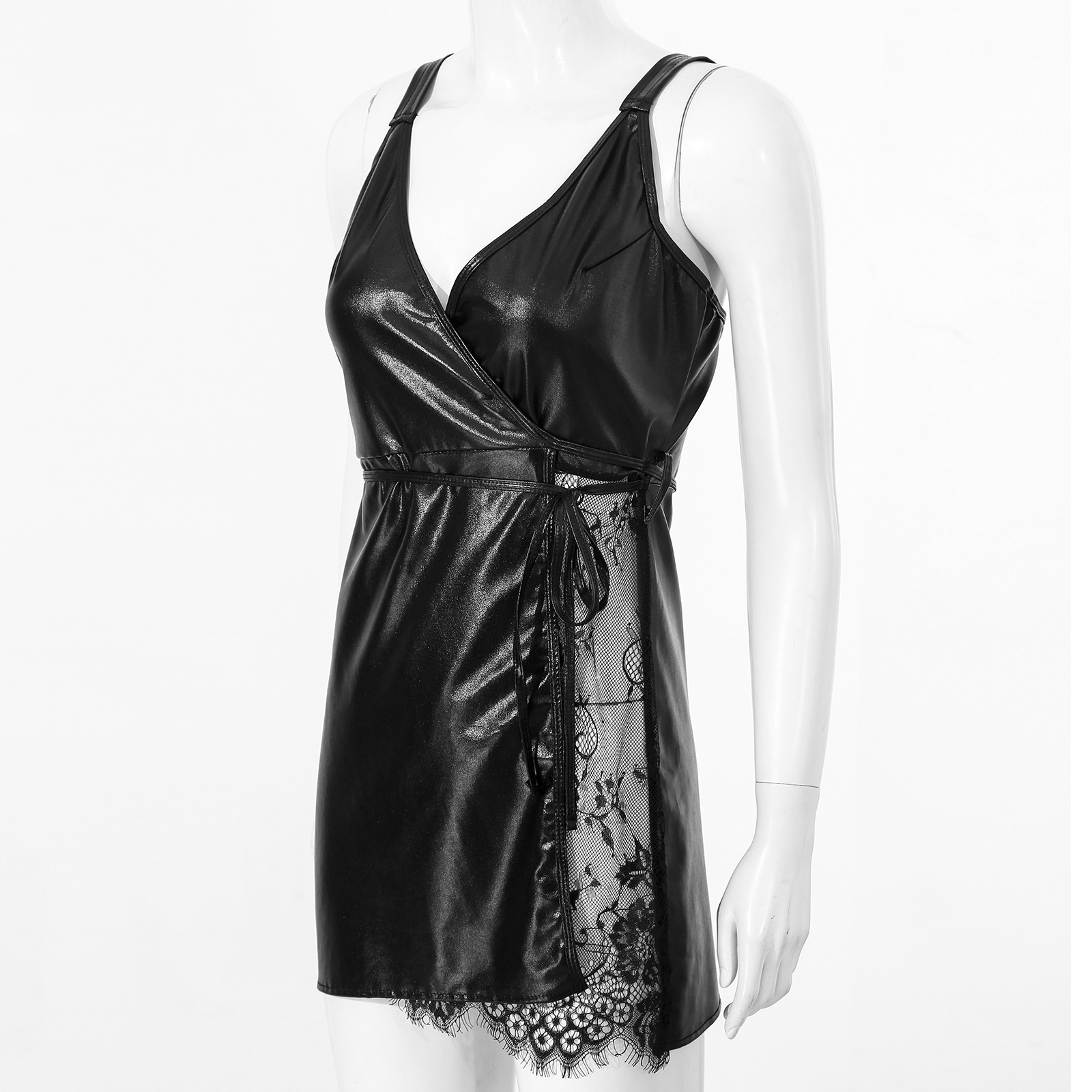 Женское платье из лакированной кожи с v-образным вырезом и широкими лямками, прозрачное кружевное платье с поясом в стиле пэчворк.