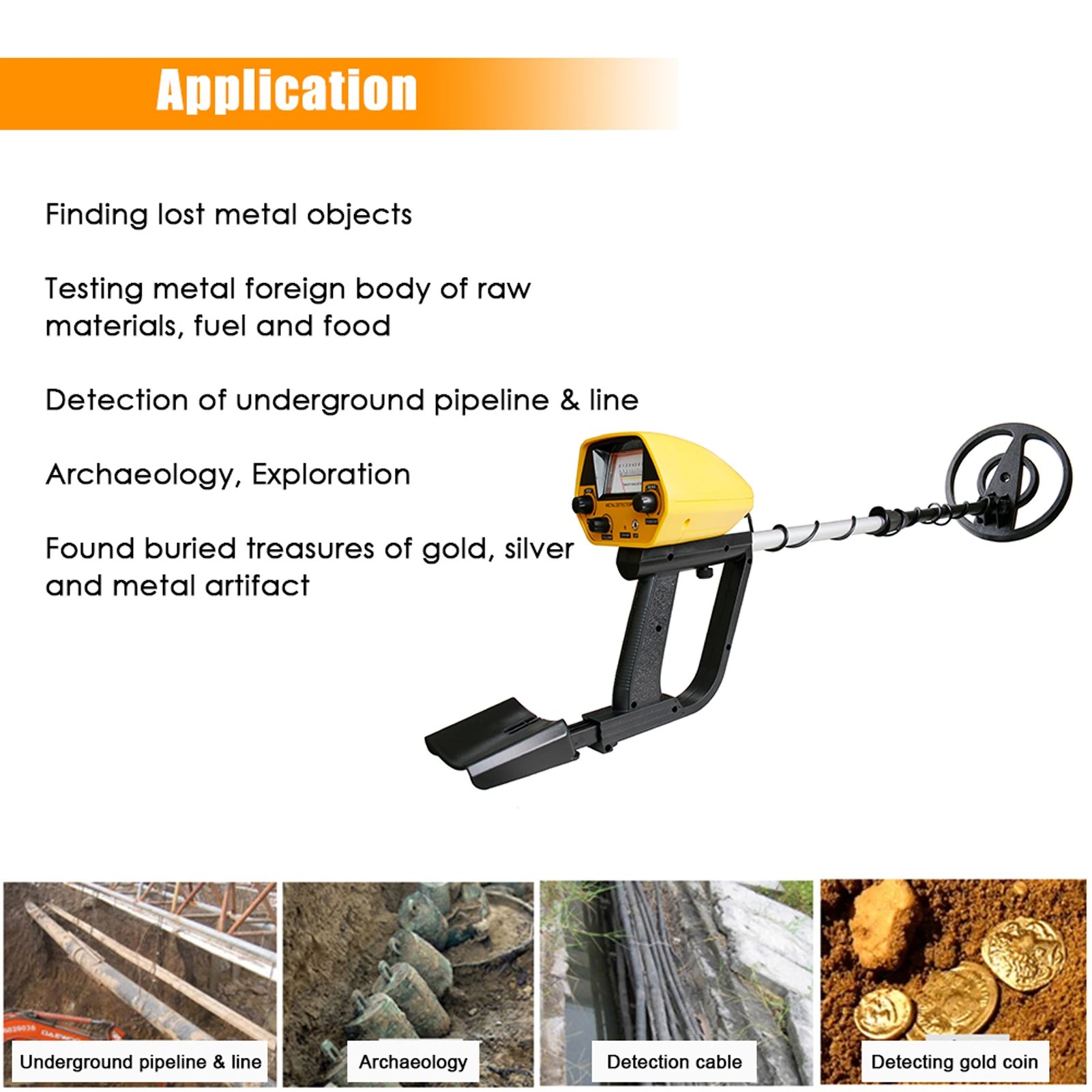 Применение: тестирование металлического инородного тела r-aw материалов, топлива и продуктов питания, обнаружение подземного трубопровода и линии, геологии, исследования, обнаружены похороненные сокровища золота, серебра и металла артефакты, приобретение металлолома промышленности, проверка металлических инородных тел в доставке и багаже.