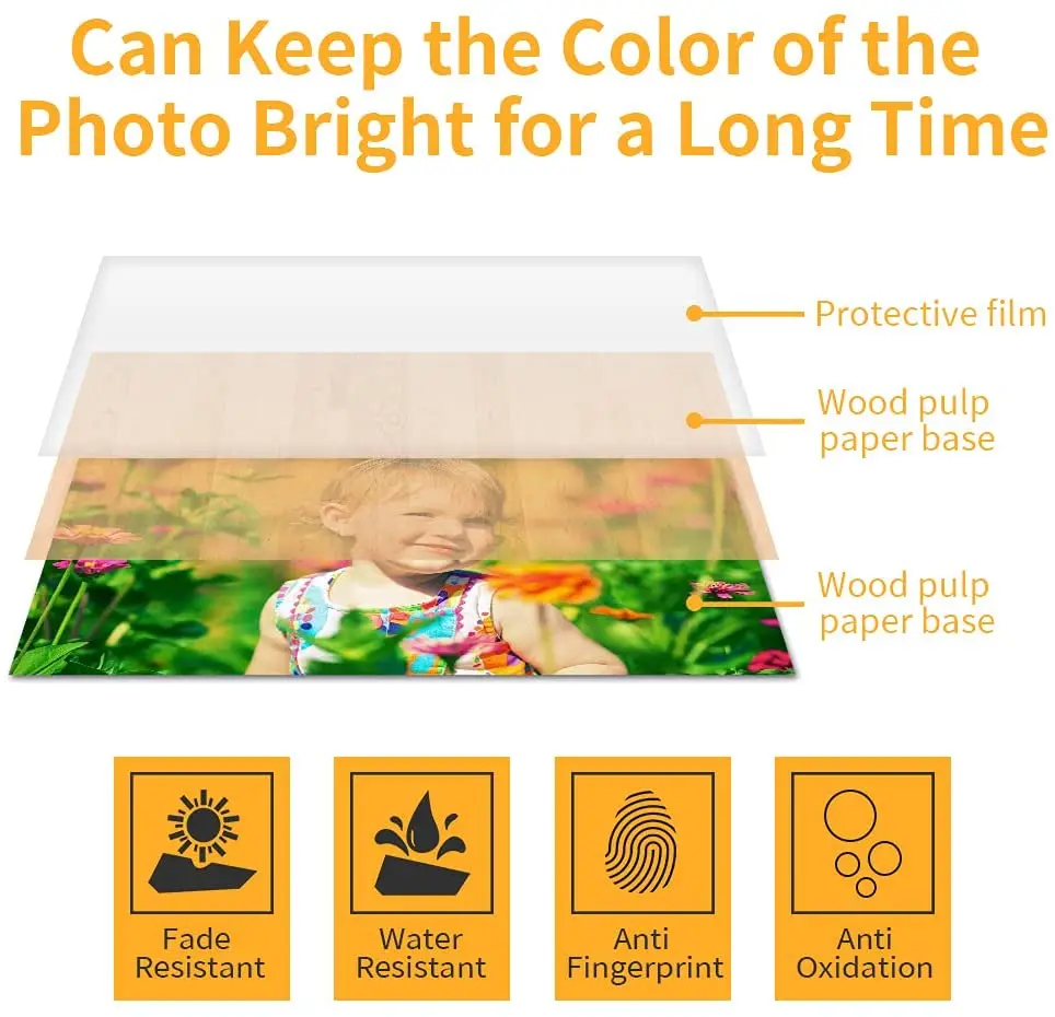 Продукт маленький и легко носить с собой, красивый внешний вид, с использованием уникальной технологии сублимации краски, может печатать высокий блеск и четкие и блестящие фотографии, Фотопечать автоматически генерирует покрытие защитной пленки, с мгновенной сушкой, отсутствие пятен, водонепроницаемость, защита от отпечатков пальцев, окисление и другие характеристики Способствуют долгосрочному хранению, Что удобно для вас, чтобы записать прекрасные моменты жизни.