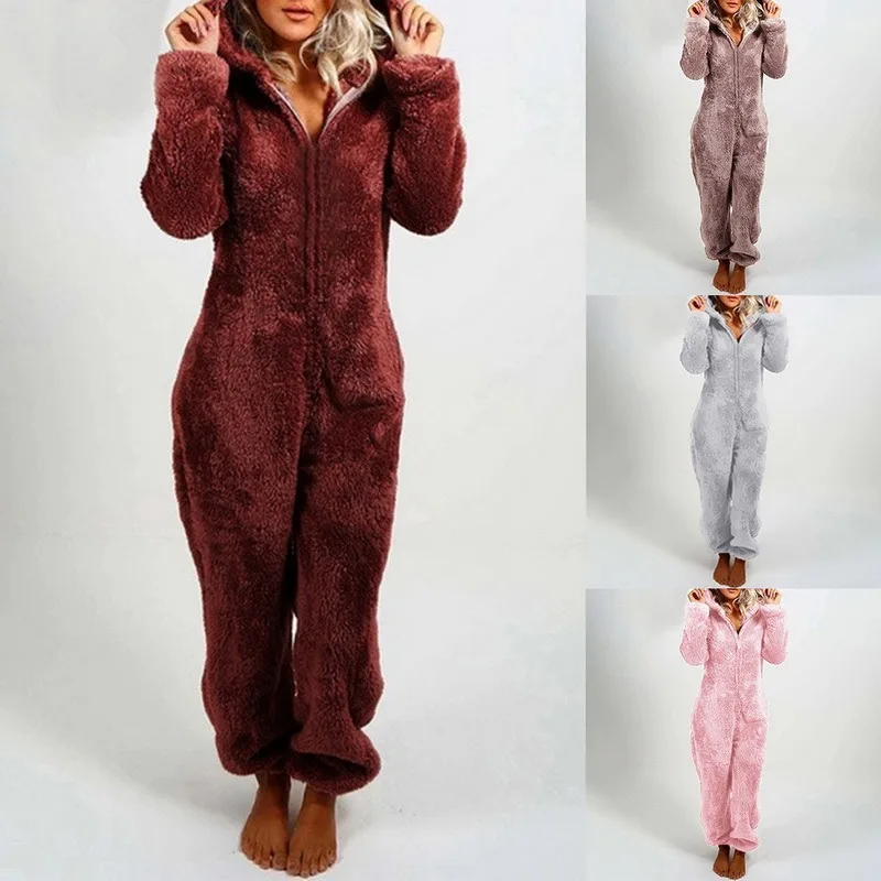 Winter Warm Pyjamas Women Onesies Fluffy Fleece Jumpsuits Sleepwear Overall Hood Sets Pajamas For Women Adult Sleepwear Mujer