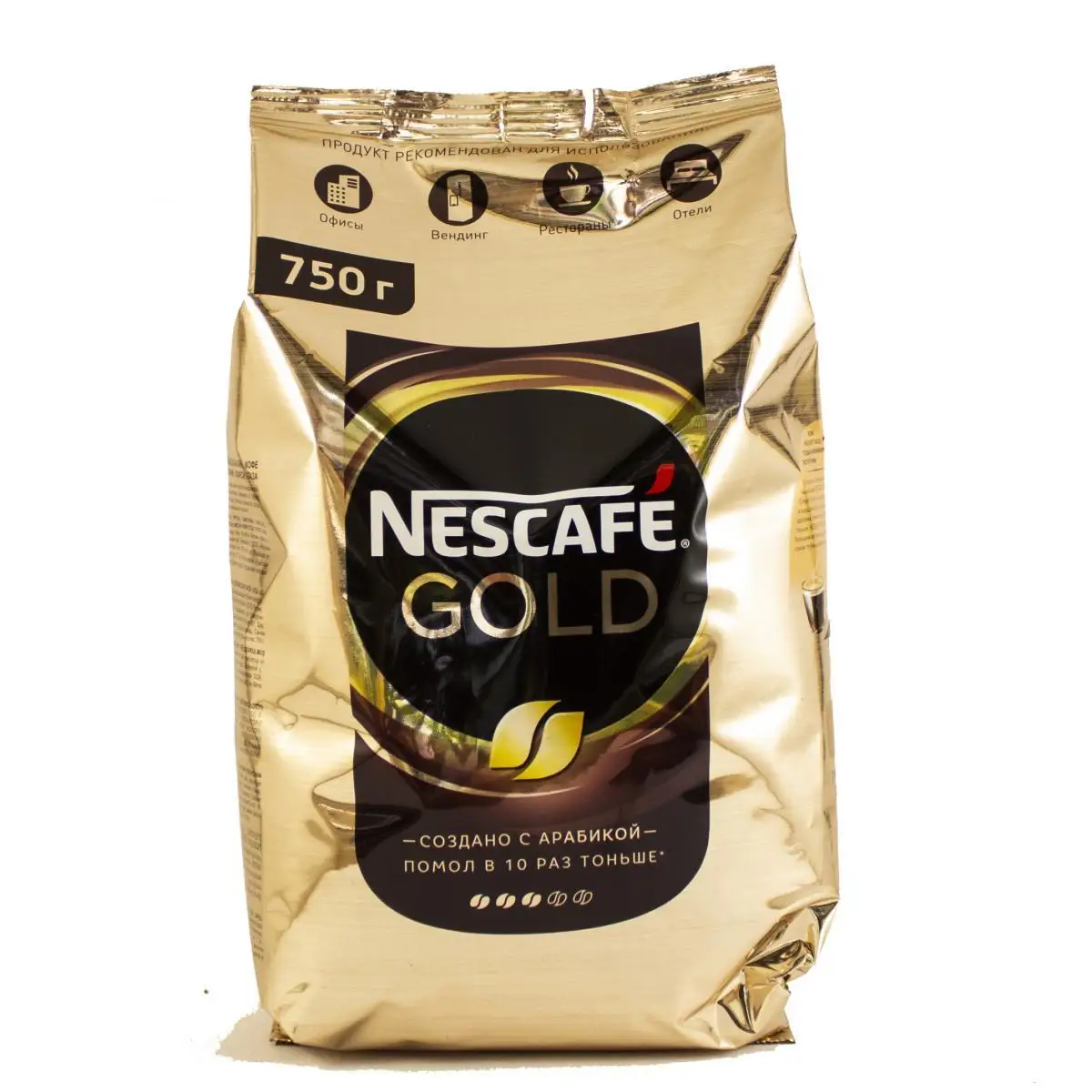 Кофе растворимый сублимированный Nescafe Gold 750 г — один из самых известных растворимых кофейных напитков! Его богатый, насыщенный аромат и глубокий вкус невозможно ни с чем перепутать, но так легко узнать из множества вариантов. Nescafe Gold создает особую, приятную атмосферу, окружая волнующим ароматом и благородным вкусом.Nescafe Gold создан лучшими кофейными экспертами из отборных зерен робусты и арабики. Он остается популярным и любимым многими поклонниками кофе по сей день. Чашка горячего крепкого напитка привычно сопровождает и тихим спокойным утром, и на шумных встречах, и в загруженные работой будни. Nescafe потребляют более чем в 180 странах мира.Готовится кофе растворимый Nescafe Gold просто. В зависимости от желаемой крепости добавьте в чашку 1-2 чайные ложки кофе и залейте горячей водой, но не кипятком. Сахар, сливки, молоко добавьте по желанию, и напиток готов. Большая вакуумная упаковка позволит вам наслаждаться им довольно долго, а также отлично подходит для использования в больших коллективах, офисах, местах общественного питания и на различных предприятиях.