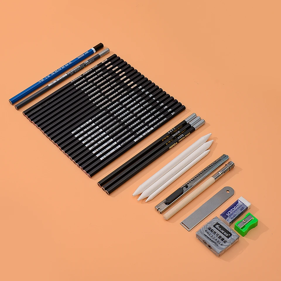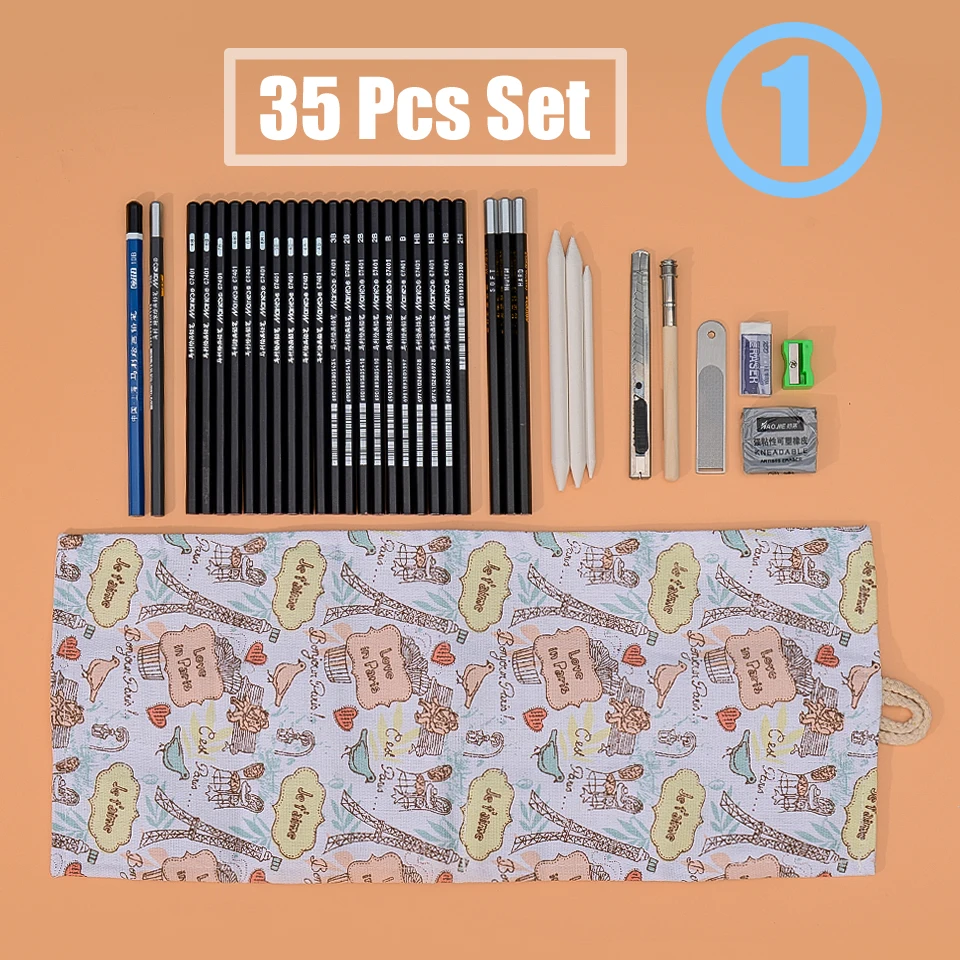 Товары включают в себя: 22 карандаша для набросков + 3 ручки для древесного угля + 9 инструментов для рисования + 1 тканевый мешок для хранения карандашей